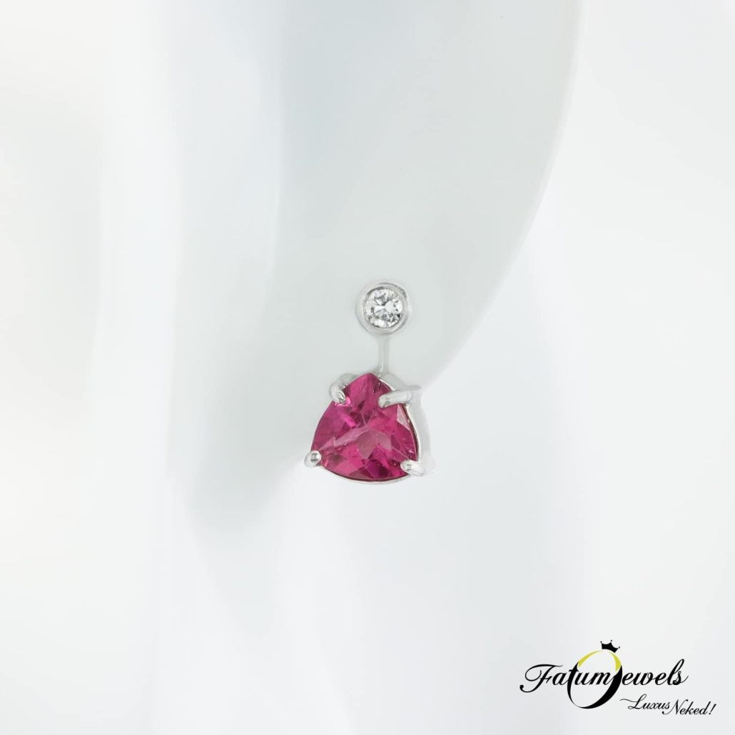 Turmalin gyémánt gyöngy szett alkalmi viselethez, illetve hétköznapokra egyaránt. Fehérarany fülbevaló egy-egy turmalinnal és gyémánttal, a medál egy barackos gyöngy drágakővel turmalin és gyémánt kíséretében alkotja a tökéletes egységet. A fehérarany és a rózsaszín árnyalatok gyönyörű kontrasztja elbűvölő, ezt a gyémánt fehér ragyogása tökéletesen kiemeli. Akár menyasszonyi viselethez is tökéletes választás lehet.