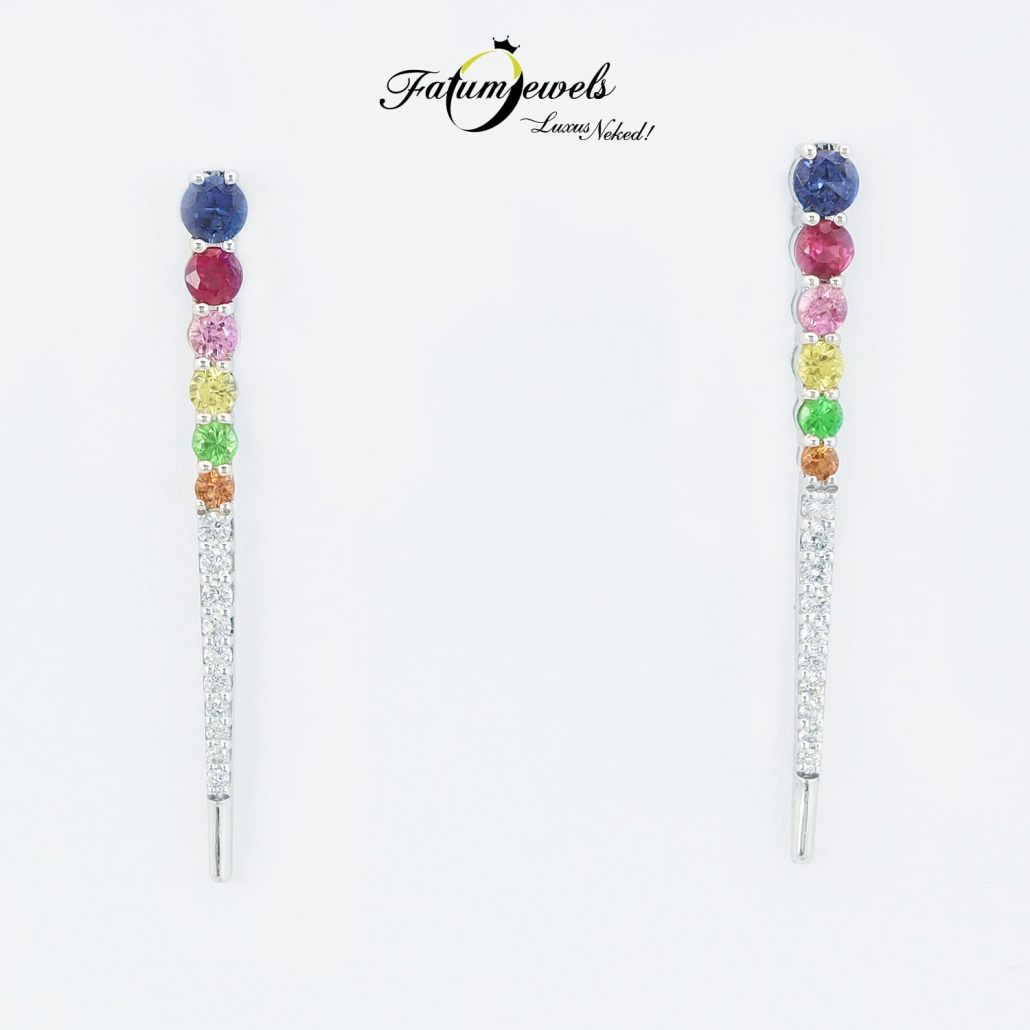 Fatumjewels színes zafír fülbevaló 0,14 karát briliáns gyémánttal, és tsavorit gránáttal. A fülbevaló színes kerek zafírokkal van díszítve, melyek a gyémántokkal és a gránáttal együtt gyönyörű kontrasztot alkot a formabontó fehérarany foglaltban. A Fatumjewels fülbevaló összesen 0,61 karát zafírt és gránátot tartalmaz. Extravagáns megjelenés valódi ragyogással ez a Fatumjewels zafír ékszer.