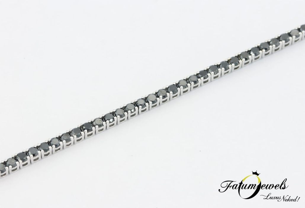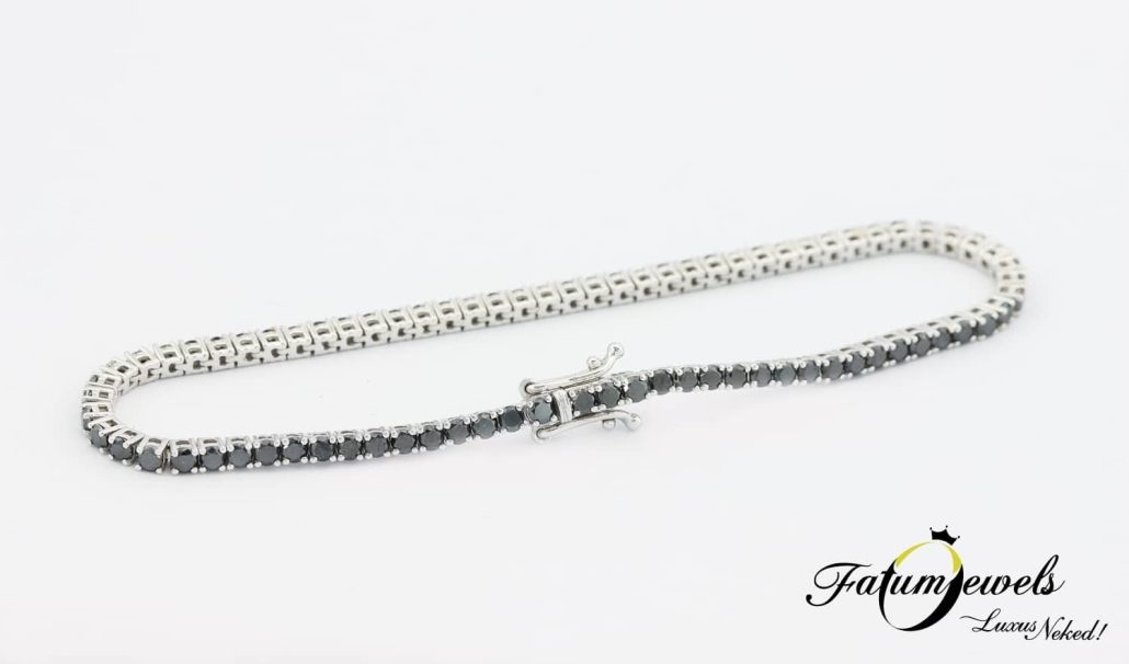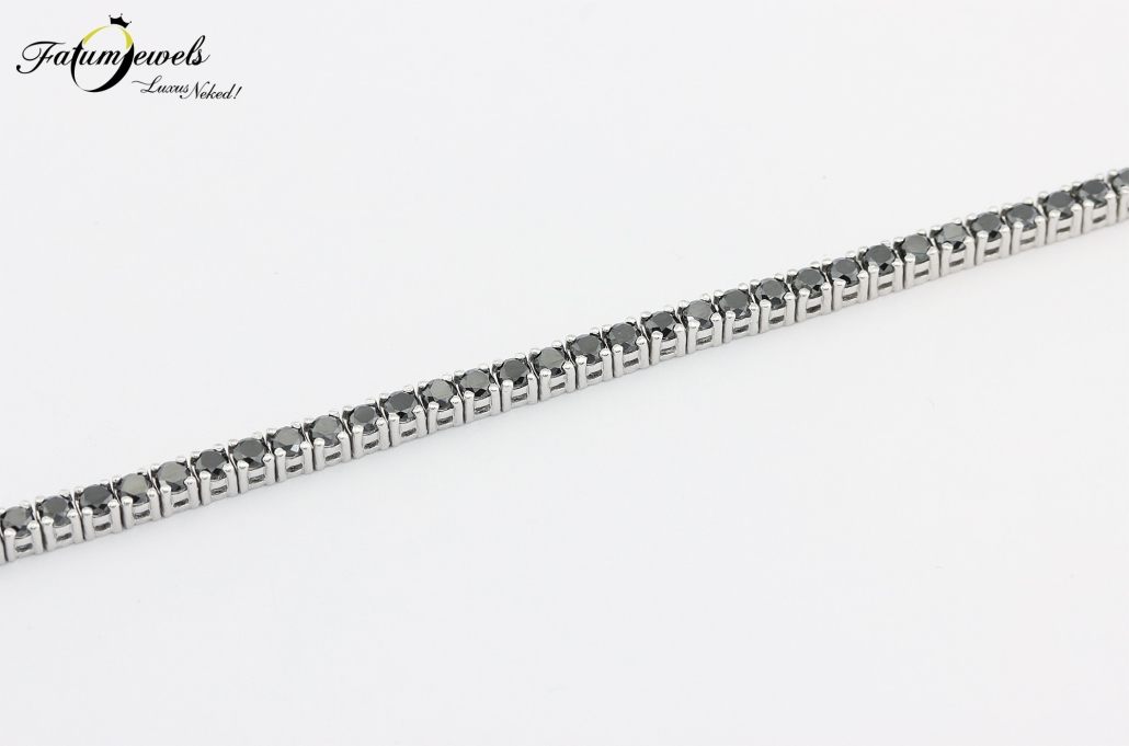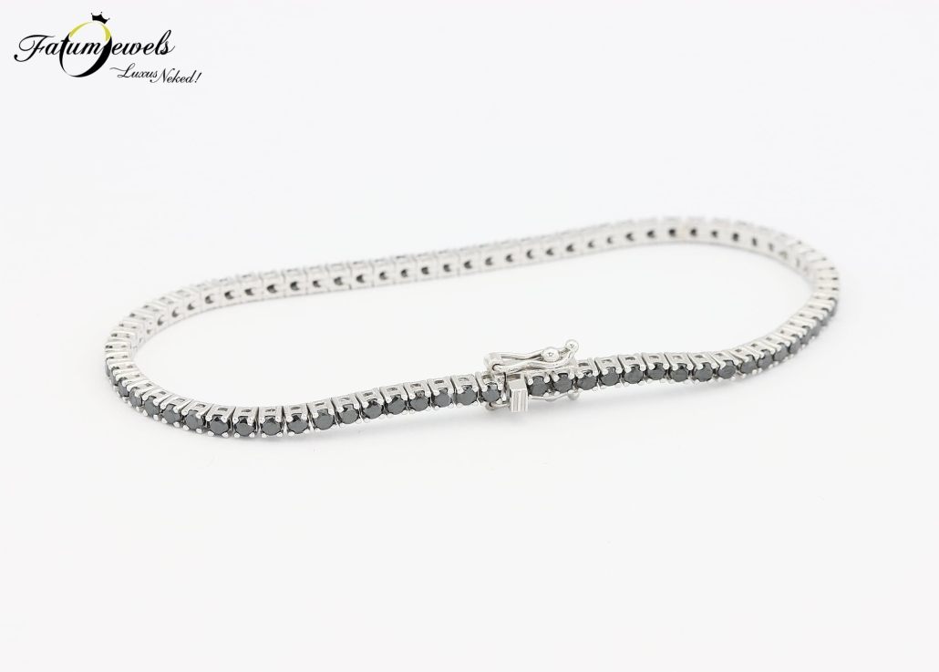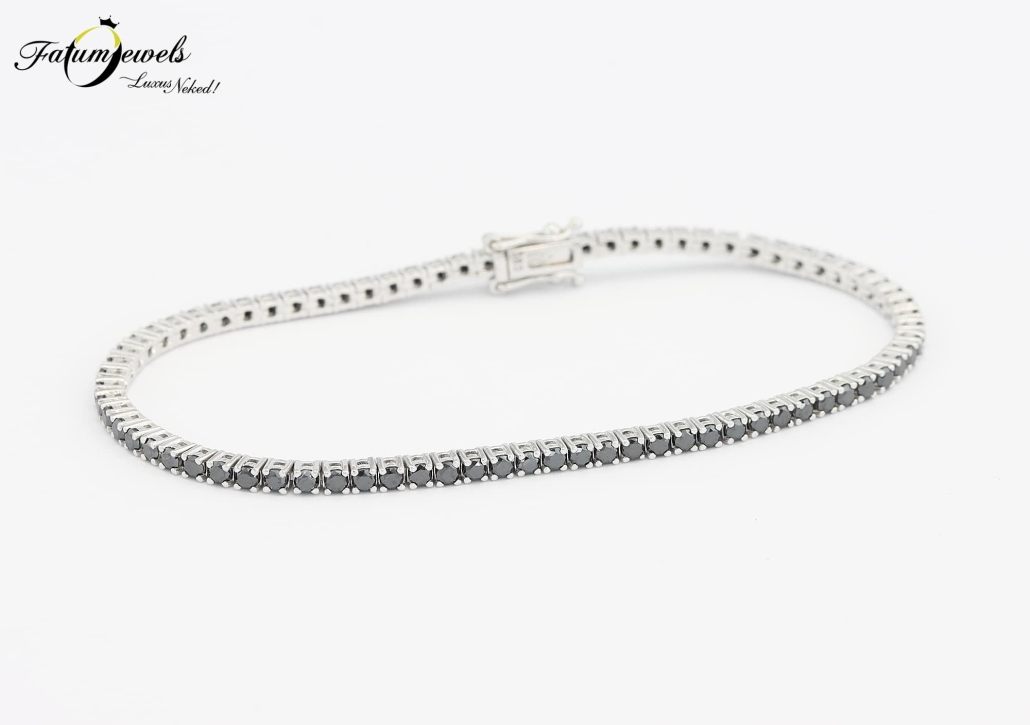 Ez a fehérarany fekete gyémánt tenisz karkötő az elegancia és luxus tökéletes szimbóluma, mely minden alkalommal kiemeli a viselője egyedi stílusát. A csillogó, precízen megmunkált és gyönyörűen ragyogó fekete gyémántok káprázatossága, azonnal a viselőjükre vonzzák az összes tekintetet. Az éjfekete gyémántok 14 karátos fehérarany foglalat tartja biztosan a helyükön. Ez a karkötő tökéletes választás egy estélyre, esküvőre, vagy bármely különleges eseményre, amikor igazán ki szeretnél tűnni a társaság tagjai közül.