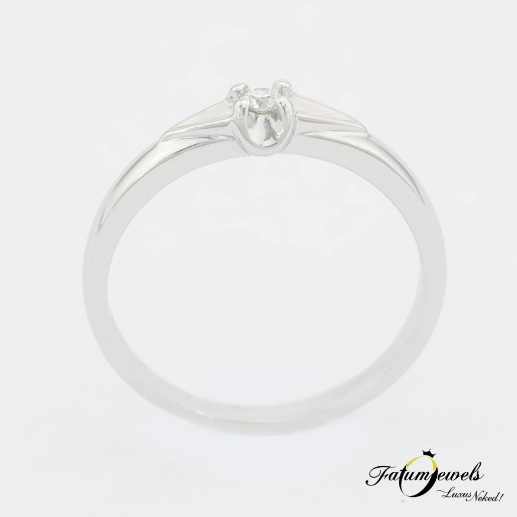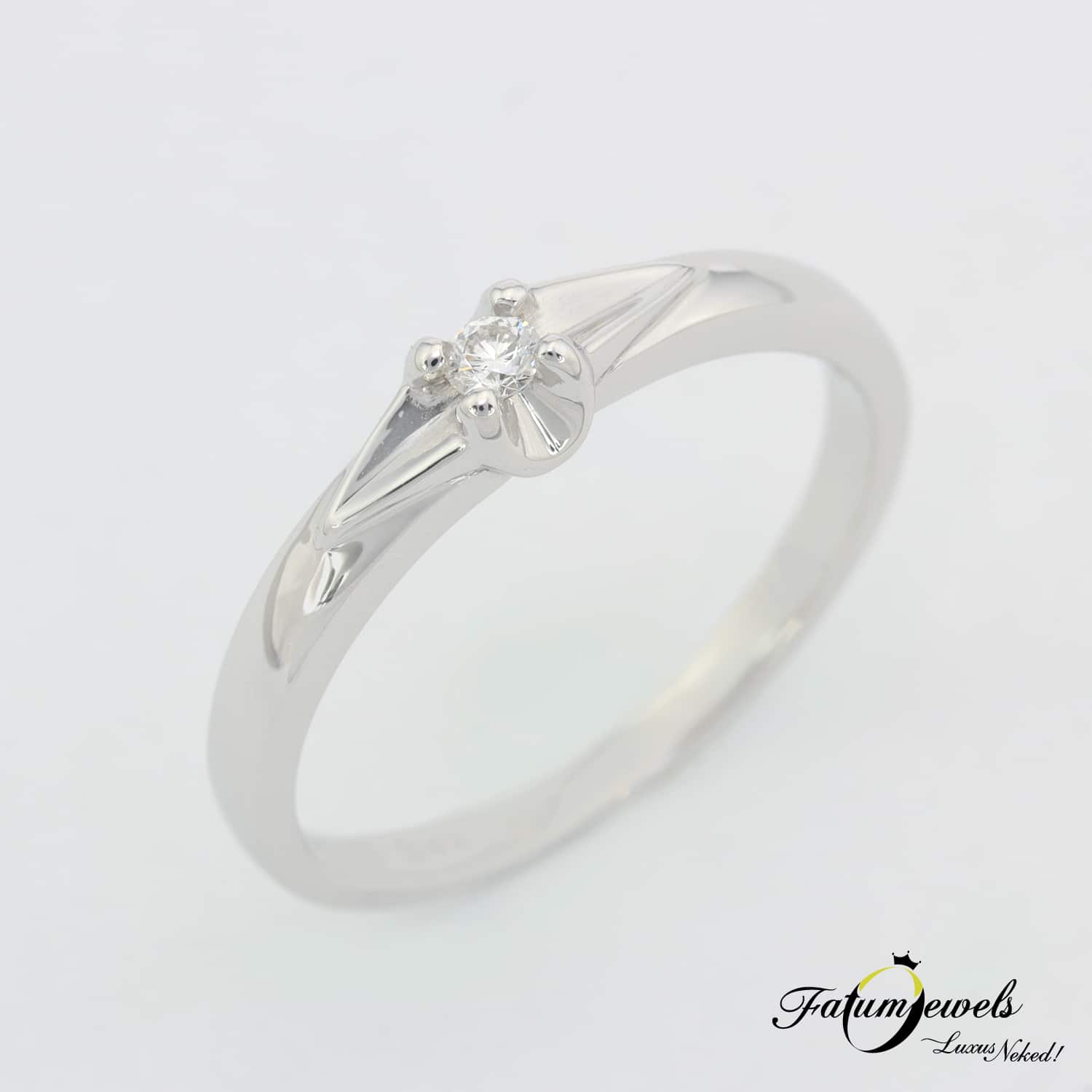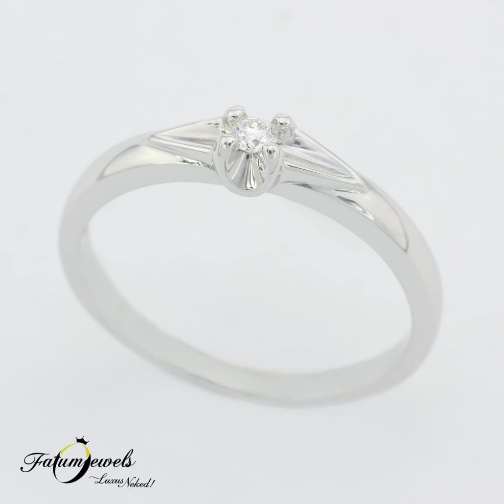 Fehérarany leveleket formáznak a vésések a gyűrűsínben, melyek egy 0,05 karátos briliáns gyémánt virágot fognak közre. A Fatumjewels Galéria olyan hölgyek számára tervezte ezt az eljegyzési gyűrűt, akik kedvelik a romantikát. Az eljegyzési gyűrű meglehetősen kedvező áron elérhető a Fatumjewels Galéria ékszer kínálatában.