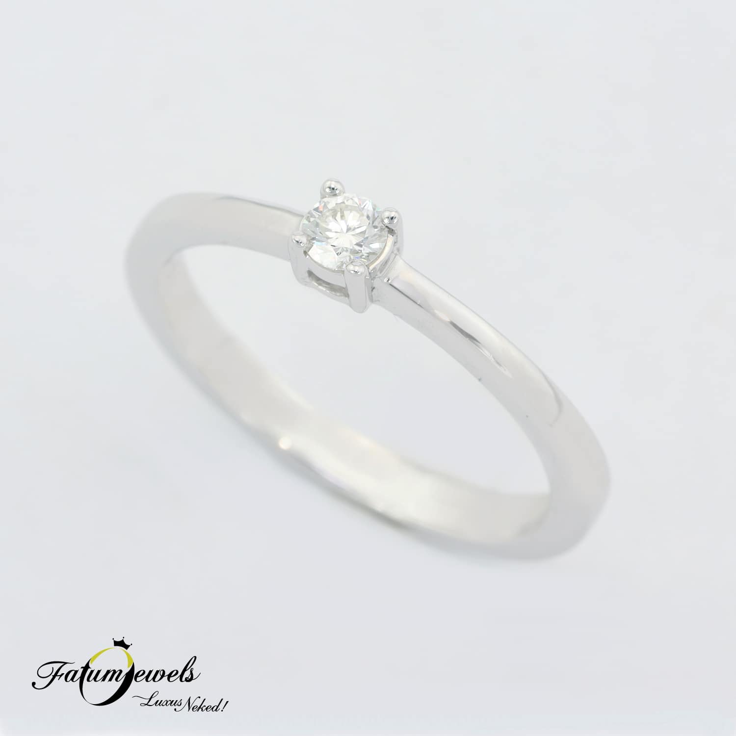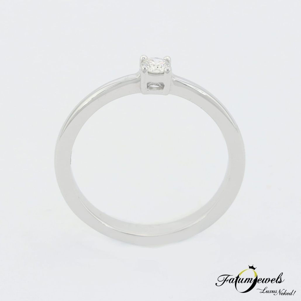 Az egyenes vonalvezetésű gyűrű előnye, hogy semmi nem vonja el a figyelmet a ragyogó gyémántokról. A Fatumjewels Galéria tervezésében készült ez a fehérarany gyémánt eljegyzési gyűrű, melynek központi drágaköve négy karmos foglalatot kapott. A szikrázó 0,10 karátos briliáns gyémánt van a figyelem középpontjában. Romantikus lánykéréshez kitűnő ajándék.
