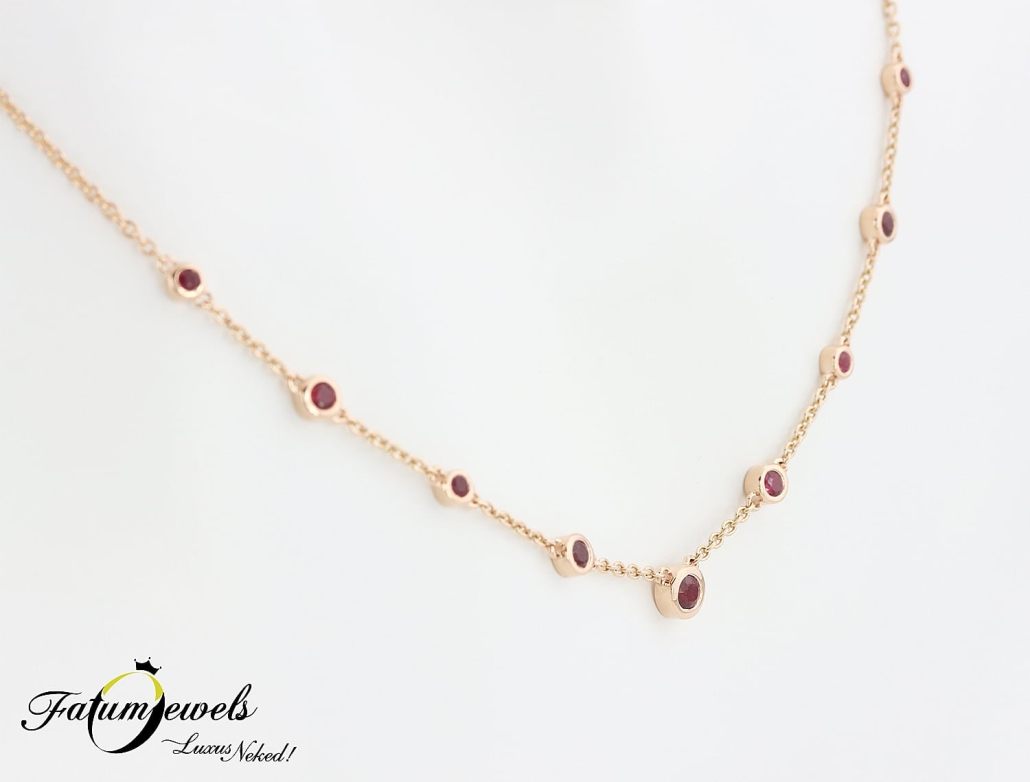 Kerek csiszolású mély vörös rubin és rose arany láncszemek ölelik körbe a nyakadat ennek a Fatumjewels rubin nyakláncnak a viselésével. Szikrázó ölelés a rubin drágakövek bűvöletében. Minden egyes rubin kerek foglalatot kapott, így tökéletesen belesimul a nyaklánc szemei közé. A középső rubin a legnagyobb és a többi mérete fokozatosan csökken.