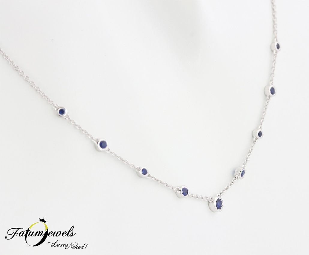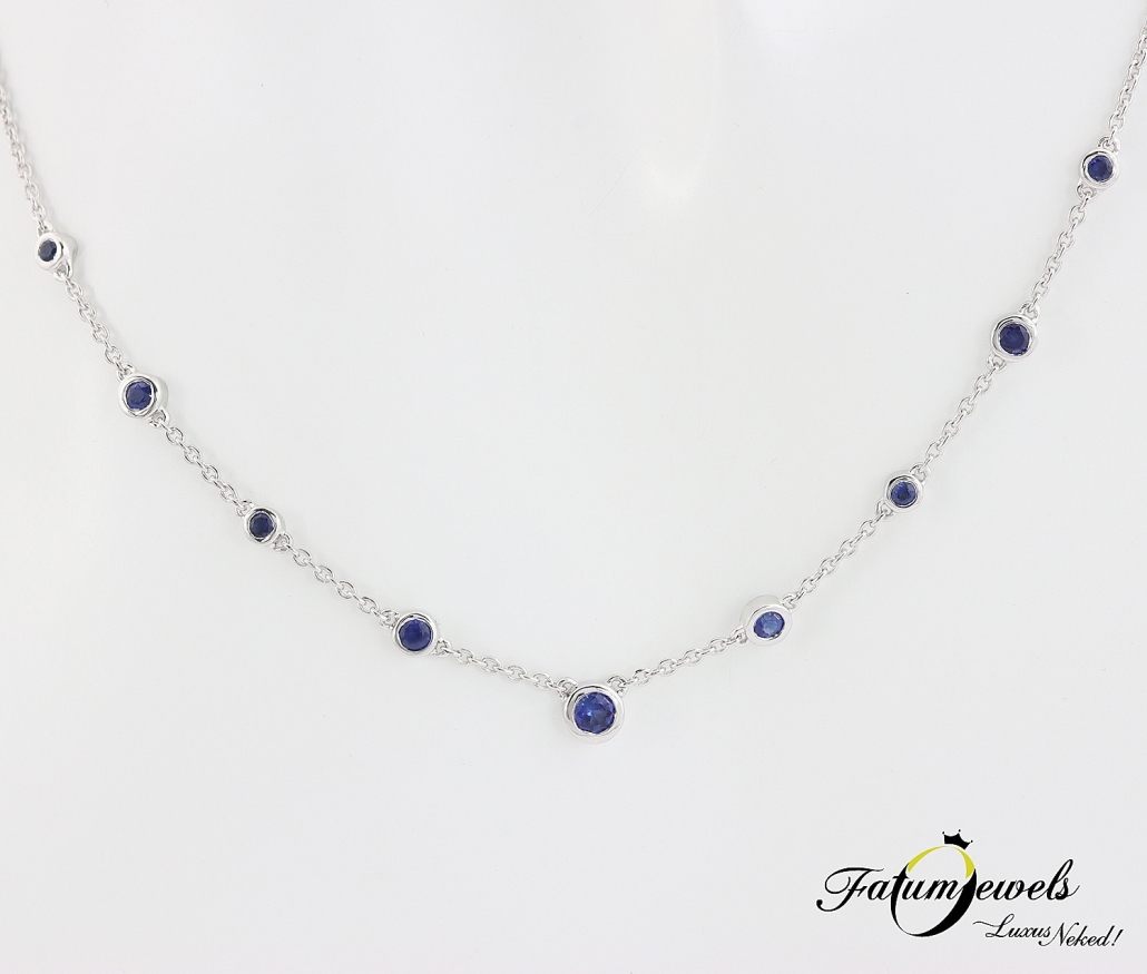 Ezeknek a kerek csiszolású mélykék árnyalatban pompázó zafíroknak, és fehérarany láncszemeknek a tökéletes összhangja teremtette meg ennek a fehérarany zafír nyakláncnak az egyedi varázsát. A természetes zafírok tiszta kékje olyan, mintha a tenger mélységének titkait viselnéd magadon. Minden egyes drágakő gondosan került rögzítésre a foglalatba, így tökéletes eleganciával simul bele a lánc finom ívébe, és vonja viselőjére a gyönyörűségre rácsodálkozó tekinteteket.