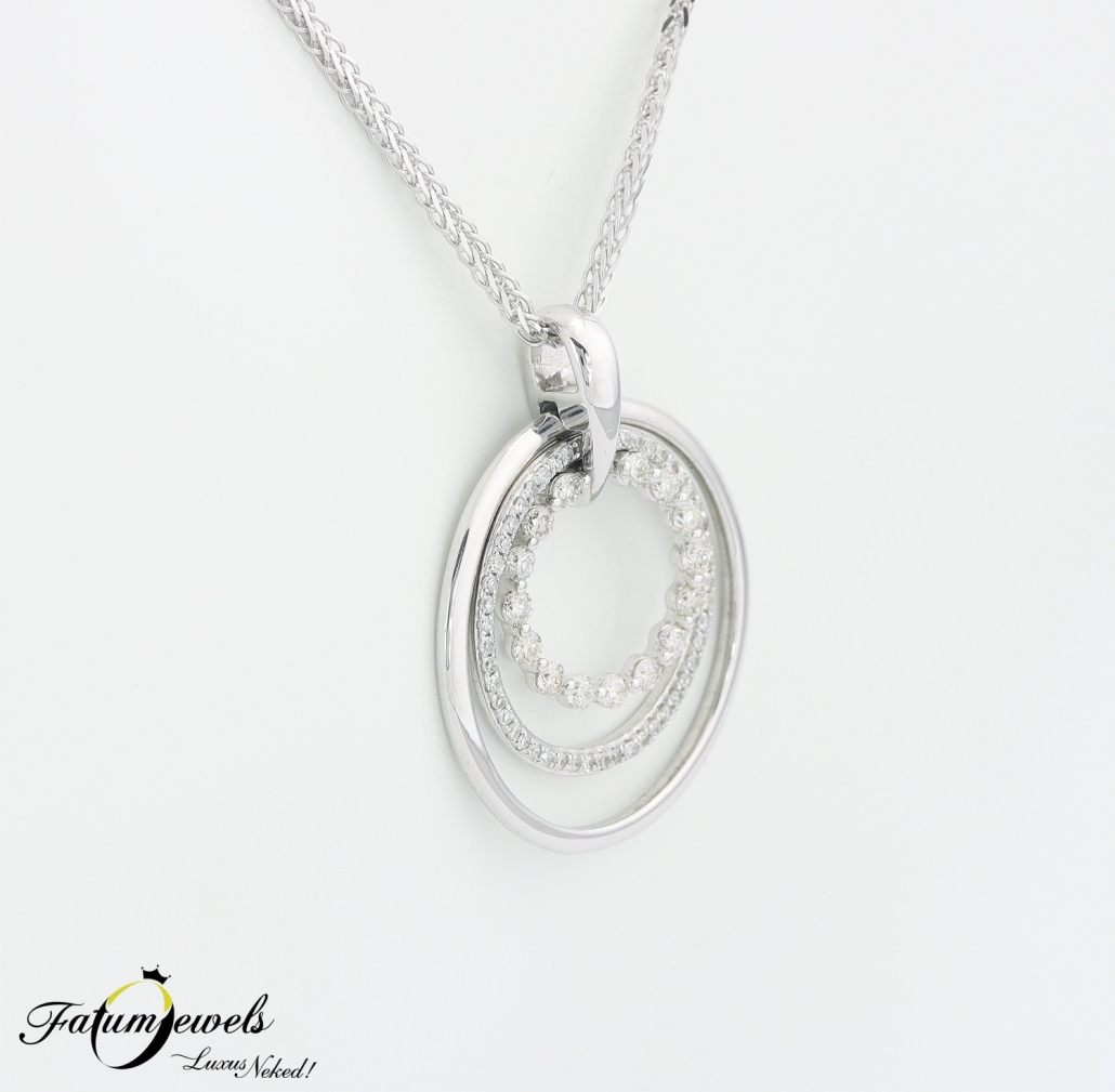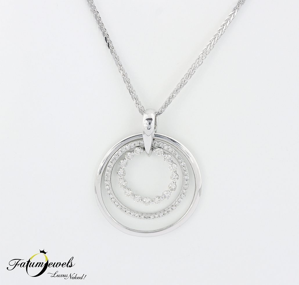 Ez a fehérarany gyémánt medál lánccal az időtlen elegancia kortalan megtestesítője, amely minden hölgynek remekül áll. A medál három koncentrikus kört formáz, amelyek finoman ölelik körbe egymást, és lenyűgözően ragyognak benne a briliáns és single cut csiszolású gyémántok fehéraranytól övezve.