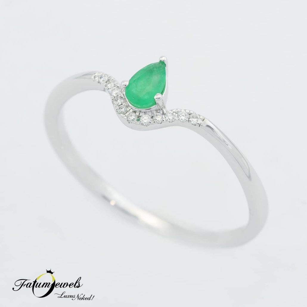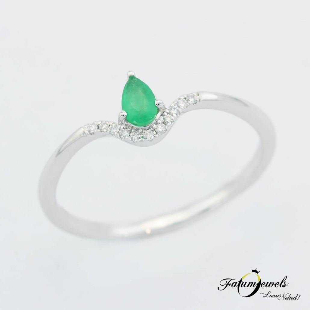 A gyűrűsín mint egy gyémántokkal ékesített aranyfonal fut a csepp csiszolású zöld smaragd mellett. Fatumjewels smaragd gyűrű tizenegy briliáns gyémánttal a különleges ékszerek kedvelőinek. Akár születésnapra, akár eljegyzésre tökéletes ajándék lehet ez a Fatumjewels Galéria által tervezett smaragd gyűrű.
