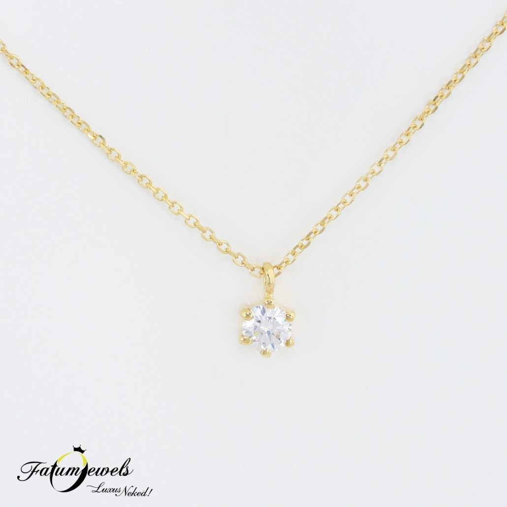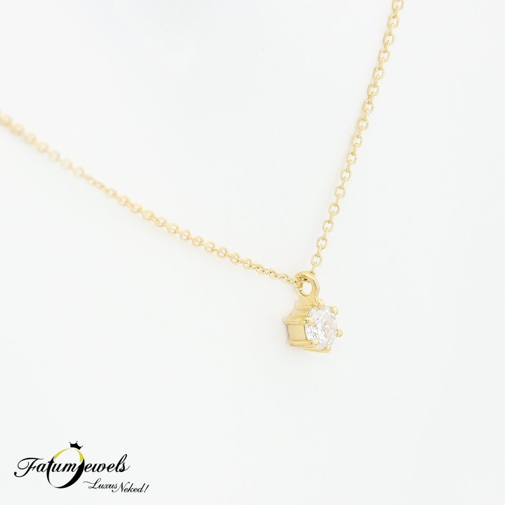 Az egyszerűség lenyűgöző szépsége, melynek ragyogását egy briliáns gyémánt adja. Kitűnő áron elérhető a Fatumjewels Galériában ez a sárga arany gyémánt medál nyaklánccal. Az ára miatt nagyszerű meglepetés ajándék lehet olyan hölgy számára, aki kedveli a hagyományos, egyszerű vonalvezetésű ékszereket.