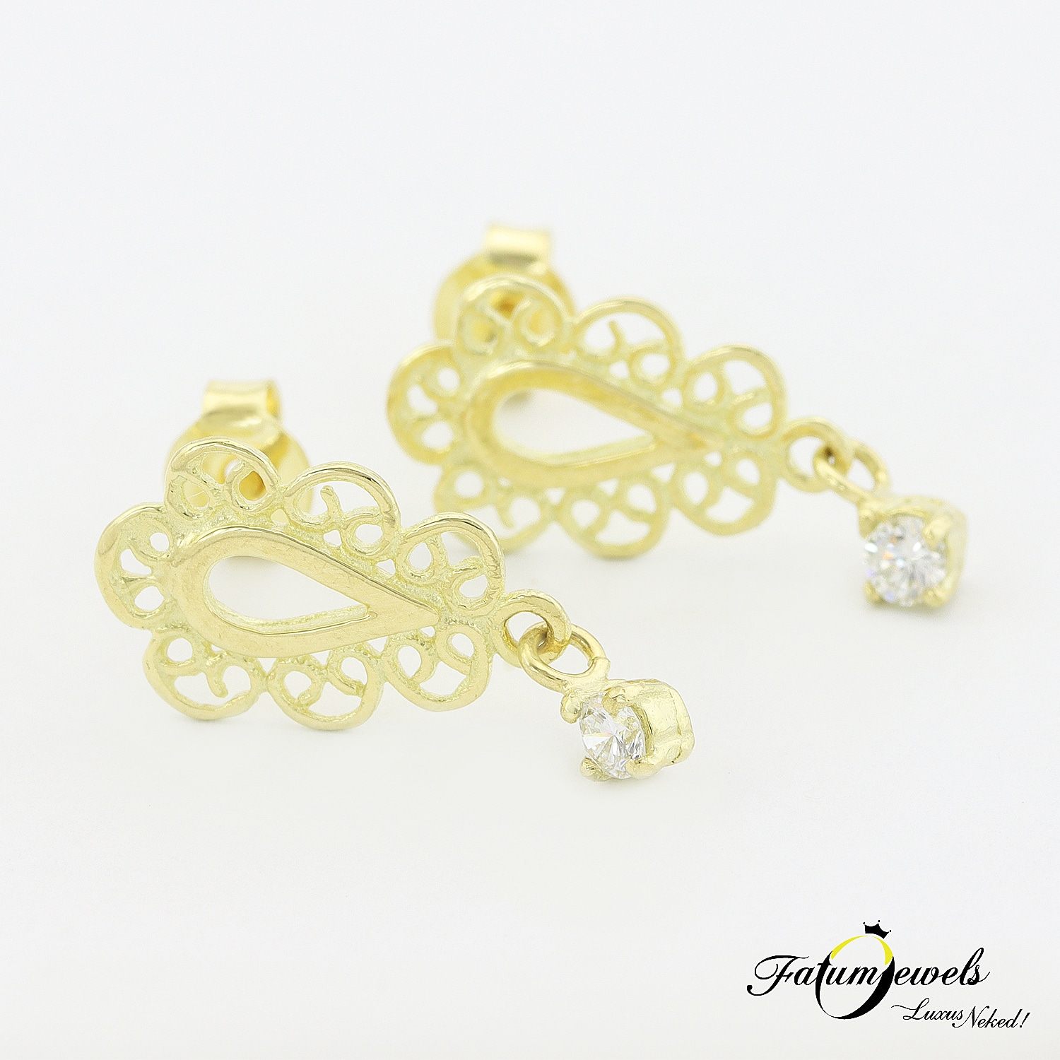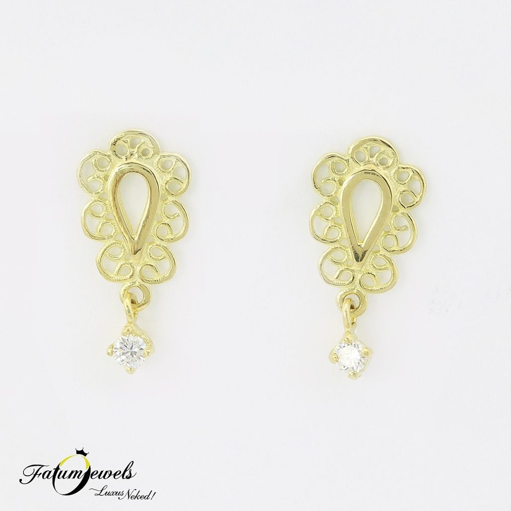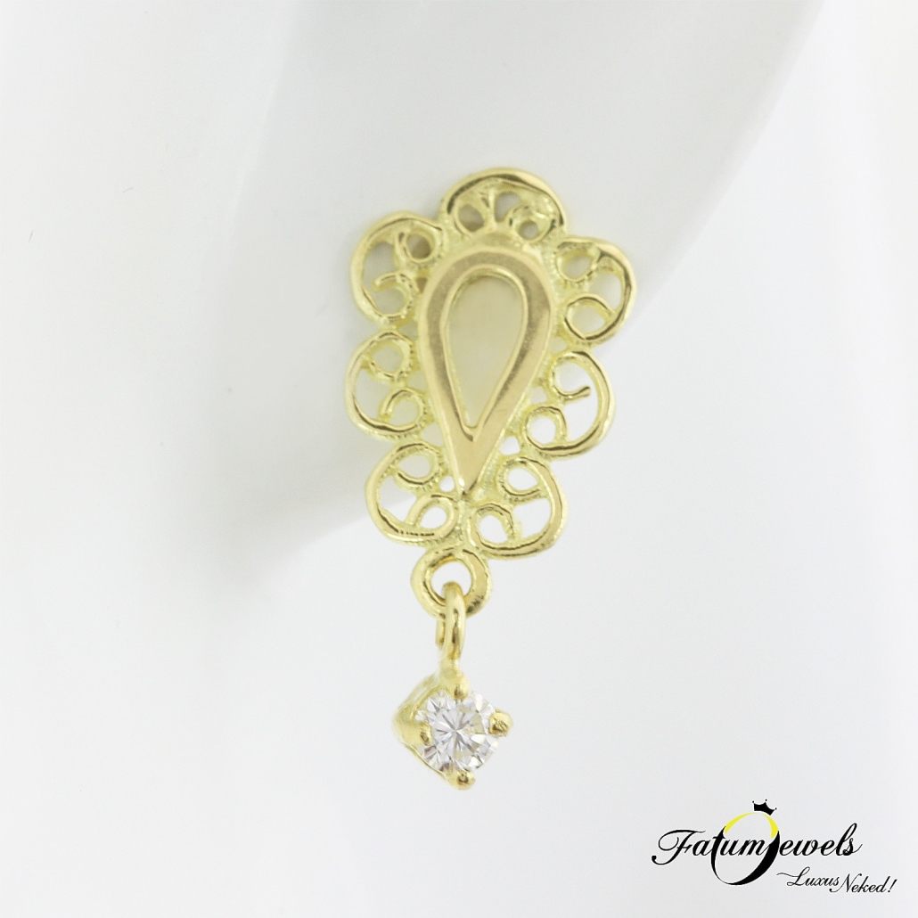Fantáziadús ékszert keresel ajándékba? Kifejező ajándék ez a sárga arany fülbevaló, mely egy-egy cizellált szélű cseppet formáz, és egy-egy 2,5 mm nagyságú briliáns csiszolású gyémánt díszít. Ha számodra is fontos a finoman kidolgozott kecsesség és a különlegesség, akkor ez a Fatumjewels Galéria által tervezett fülbevaló éppen neked készült. A mesés kelet hangulata, egy mai modern ékszerben.