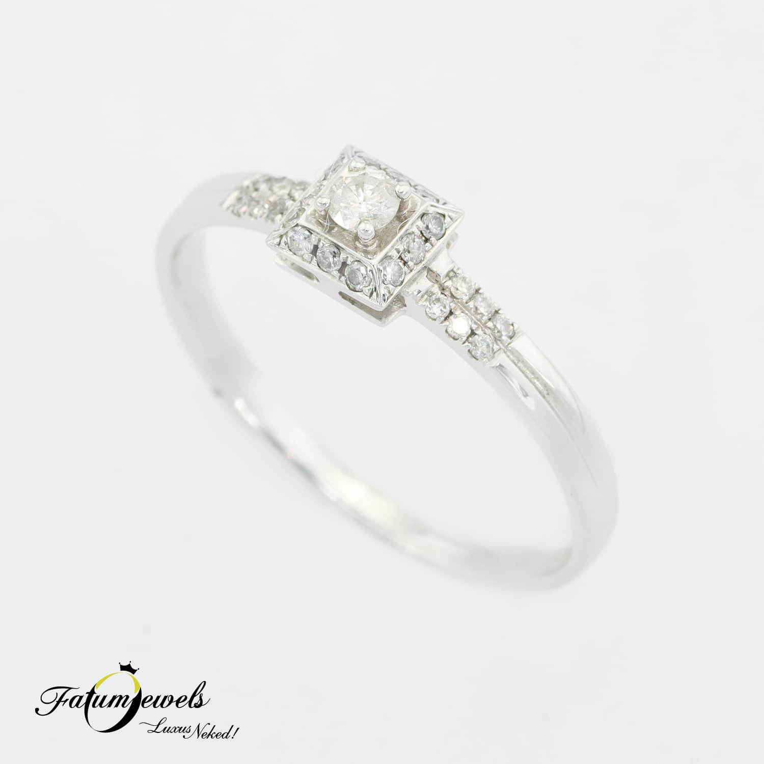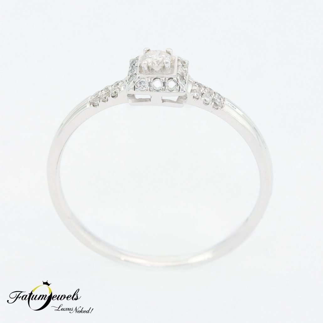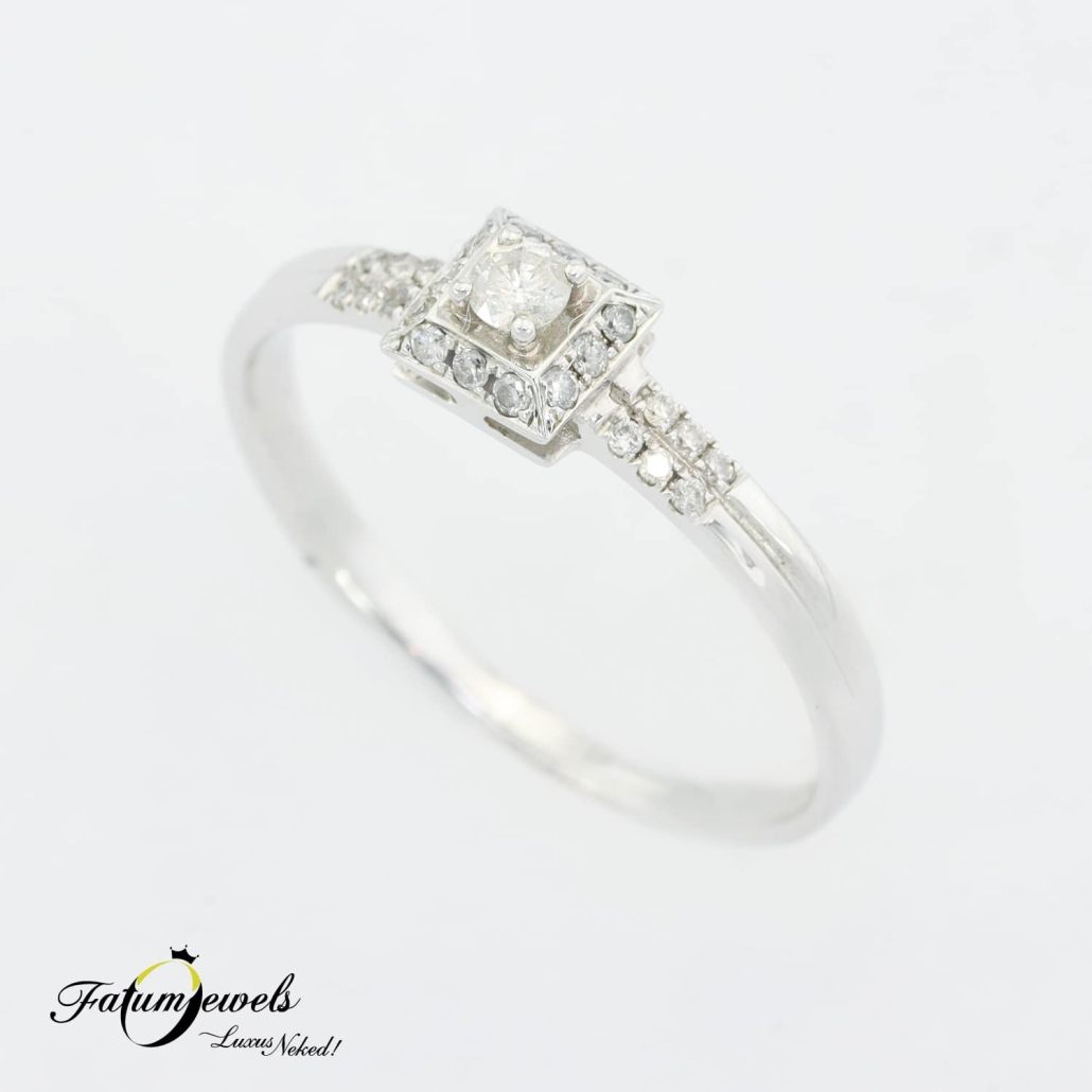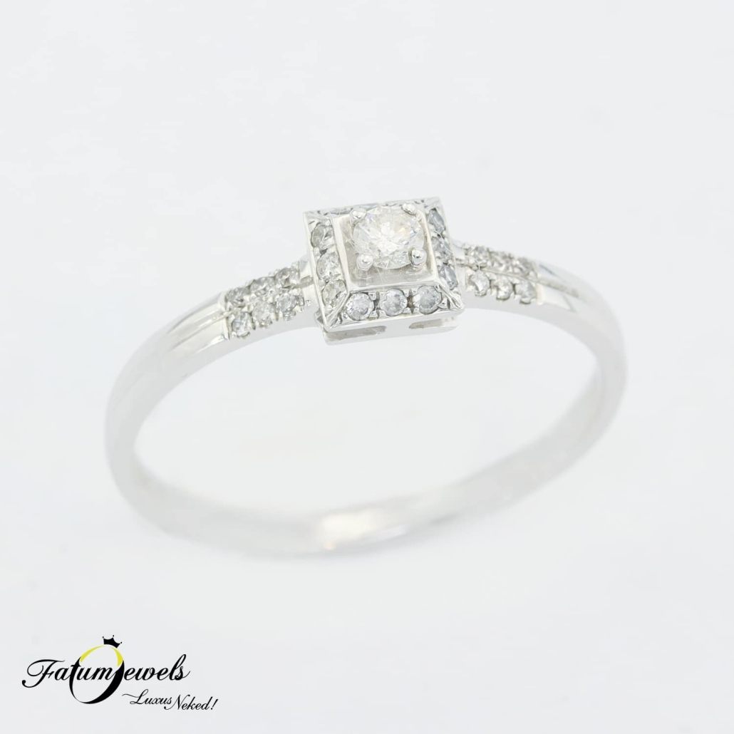 A fehérarany modern gyémánt gyűrű visszafogott eleganciájával és letisztult formavilágával hódít, és akár azonnal a tiéd lehet. A négyzetes foglalatban elhelyezett központi gyémántot apróbb kövek ölelik körül, harmonikus csillogást kölcsönözve az egész gyűrűnek. Ez a fehérarany modern gyémánt gyűrű különösen azoknak a hölgyeknek ajánlott, akik szeretik a modern, letisztult stílust, de szeretnének egy kis csillogást is vinni a hétköznapokba.