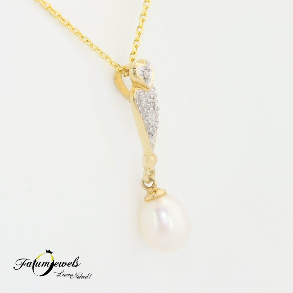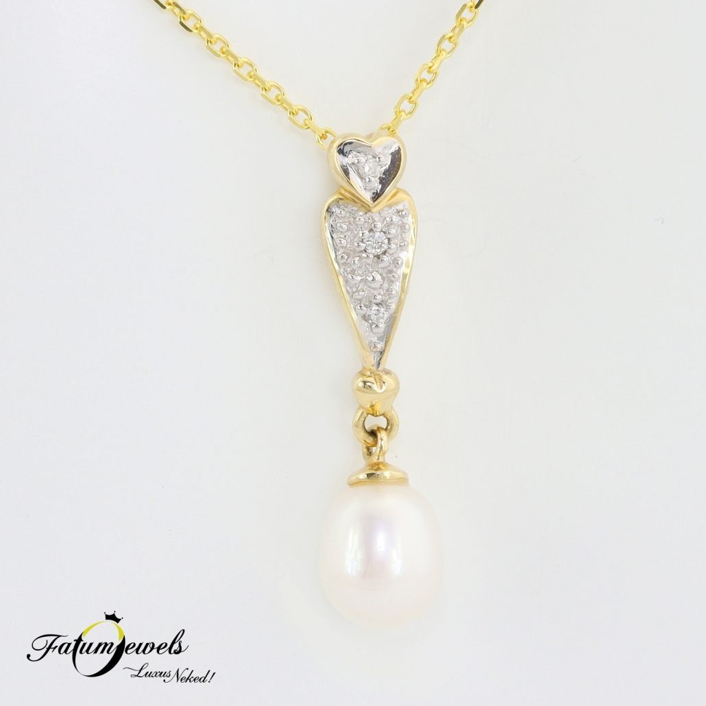 A szeretet szimbóluma összesen 0,02 karát gyémánttal díszítve. Ez keretezi a hófehér gyöngyöt. A gyöngy a tenger kincse, mely kagylóból született, akárcsak Vénusz, a szépség és szerelem istennője. Éppen ezért a gyöngy ma is a szeretetet és tisztaságot jelképezi. Menyasszonyi ékszerként vagy házassági évfordulós ajándékként kitűnő választás ez a Fatumjewels sárga arany gyémánt gyöngy medál nyaklánccal.