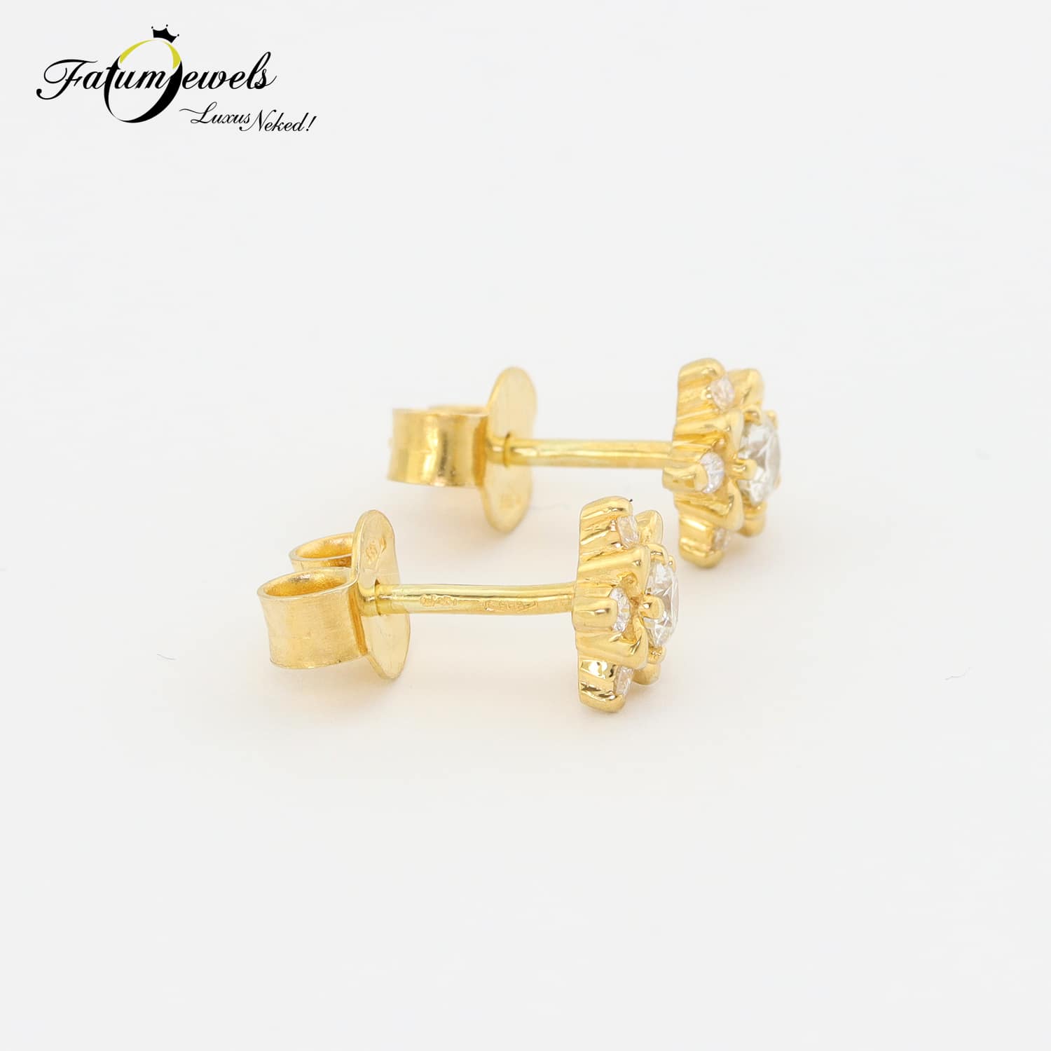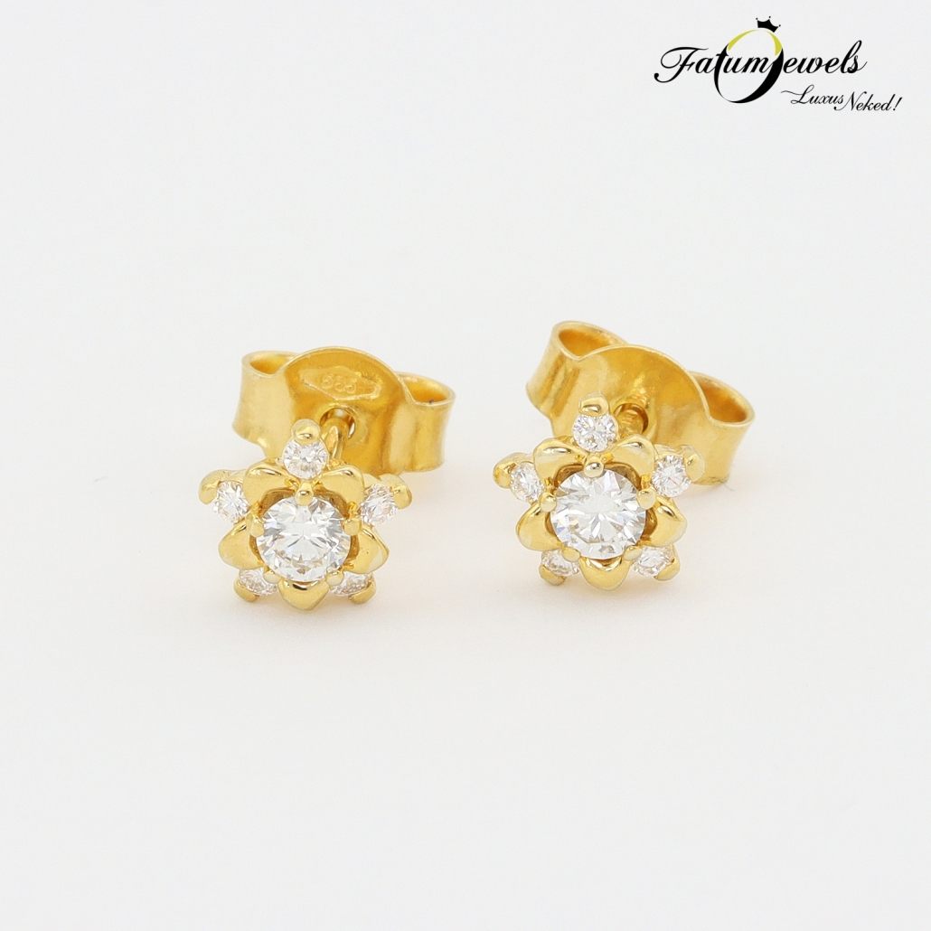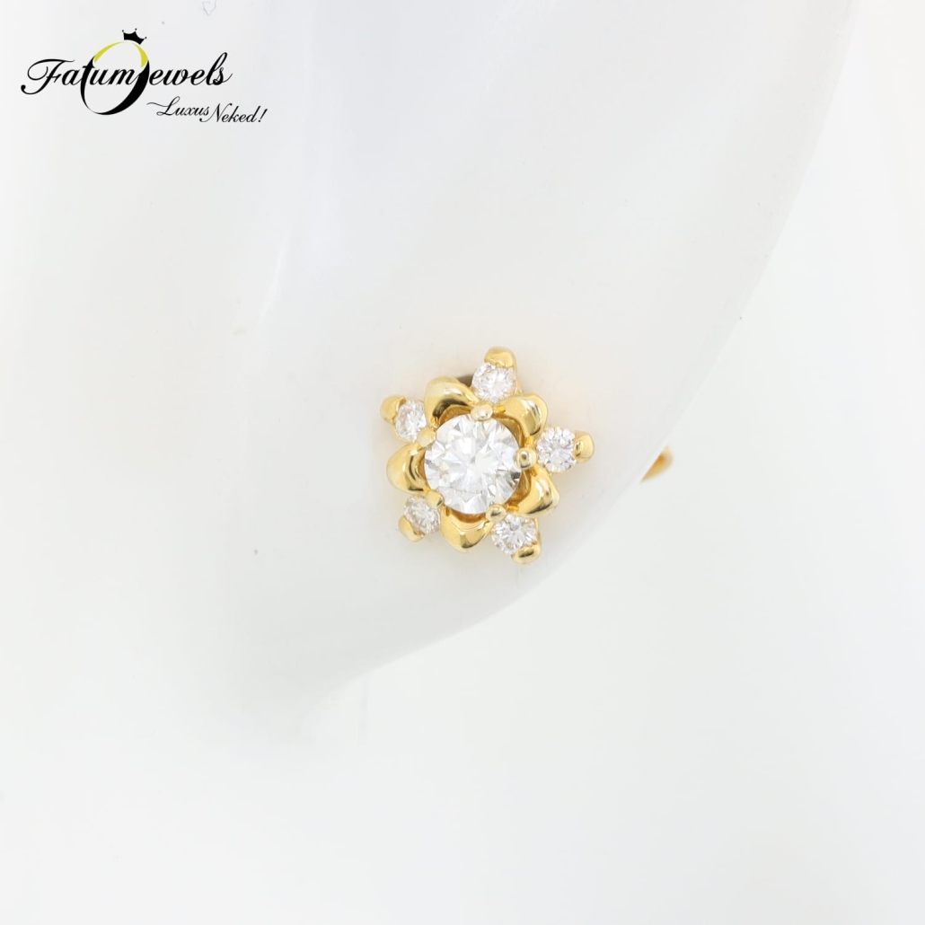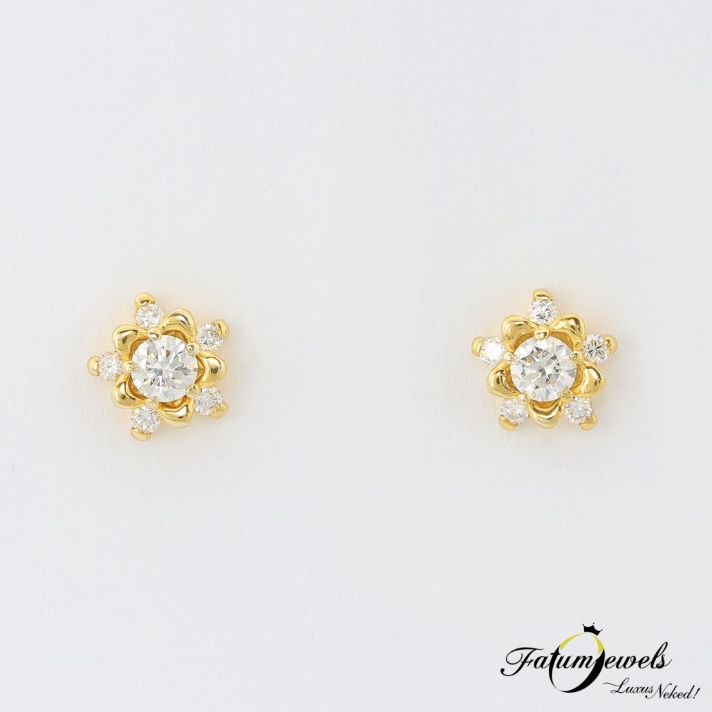 Csodálatos arany virágszirmok ölelik körbe az központi briliáns gyémánt drágakövet, míg a kisebb gyémántok mint a harmatcseppek csillannak meg szirmok külső részén. A modern formavilág a múlt üzenetét hordozza. A romantika és korszerű ékszerkészítés találkozik ebben sárga arany gyémánt fülbevalóban. Tökéletes ajándék ékszer, ami rabul ejti az érzékeket. Fatumjewels Galéria által megálmodott sárga arany gyémánt fülbevaló.