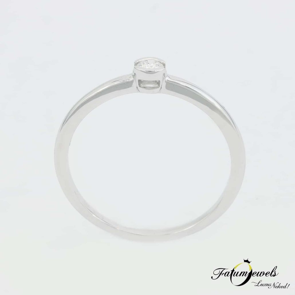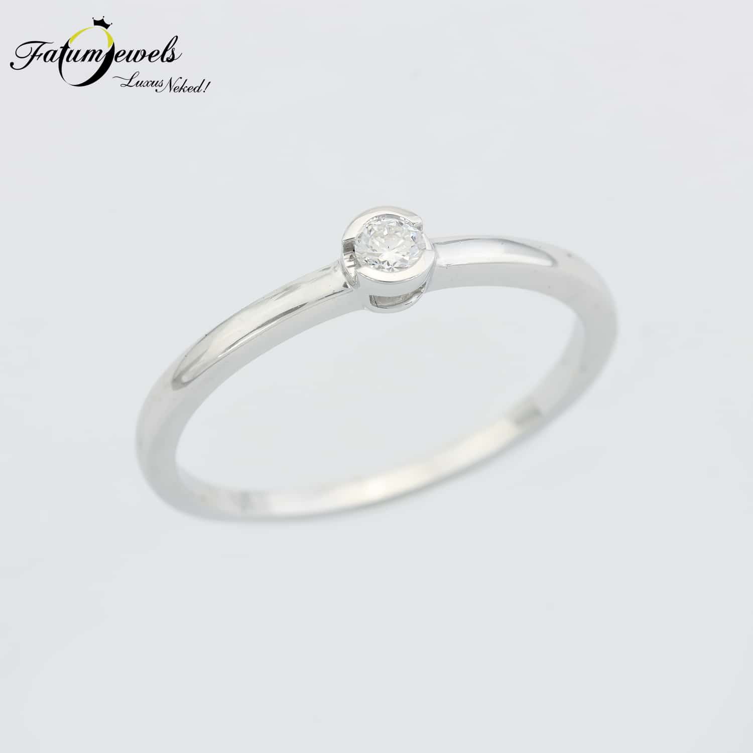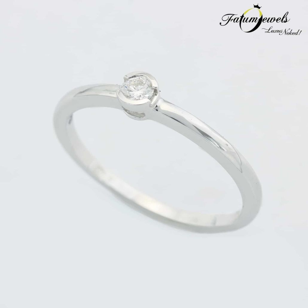 Egyszerű formatervezésű, mégis meglepő megjelenésű fehérarany gyémánt eljegyzési gyűrű a Fatumjewels Galéria arany ékszer kínálatában. A gyűrű klasszikus tokos foglalata két oldalt nyitott, ezzel növeli a 0,08 karátos briliáns gyémánt drágakő ragyogását, és azt még hangsúlyosabbá teszi. Klasszikus forma, modern újragondolása. Fejezd ki ezzel a gyűrűvel az érzelmeidet! Lánykéréshez ideális briliáns gyémánt eljegyzési gyűrű.