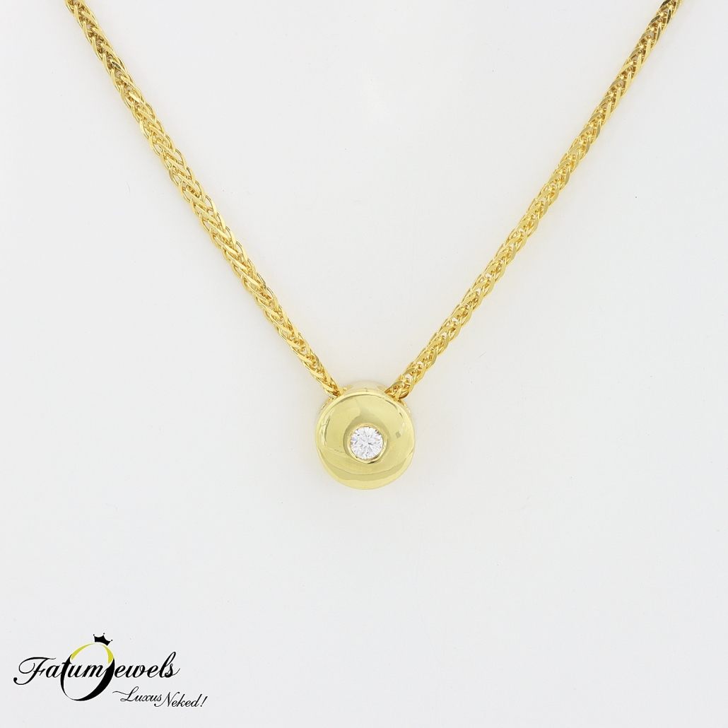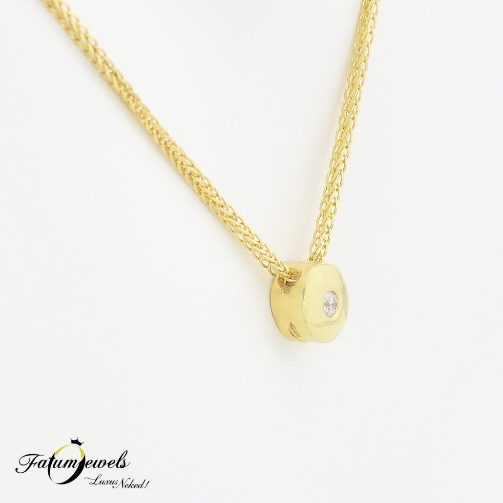 Ez a klasszikus sárga arany button gyémánt medál lánccal tökéletes választás azoknak, akik a diszkrét eleganciát és a kivételes minőséget értékelik. A központi finom fehér színű 0,035 karátos briliáns gyémánt nem hivalkodó, mégis azonnal magára vonzza a tekintetet tiszta ragyogásával.