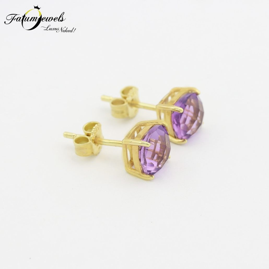 Csodás sárga arany fülbevaló ibolyaszín fantázia csiszolású ametiszt drágakővel alkalmi vagy hétköznapi viseletre egyaránt a Fatumjewels Galéria ametiszt ékszer kínálatából. Az ára igen kedvező, így akár meglepetés ajándék is lehet olyan hölgyek számára, akik előnyben részesítik a lila színt.