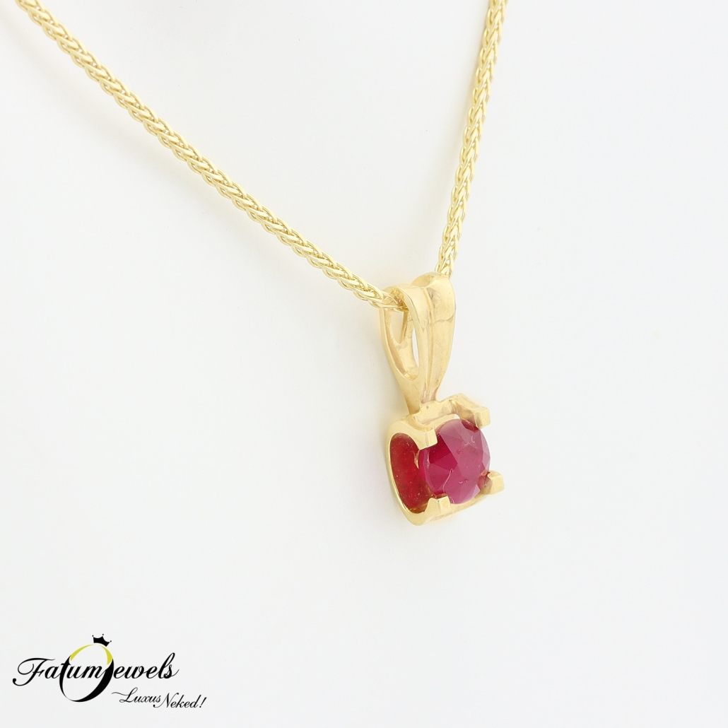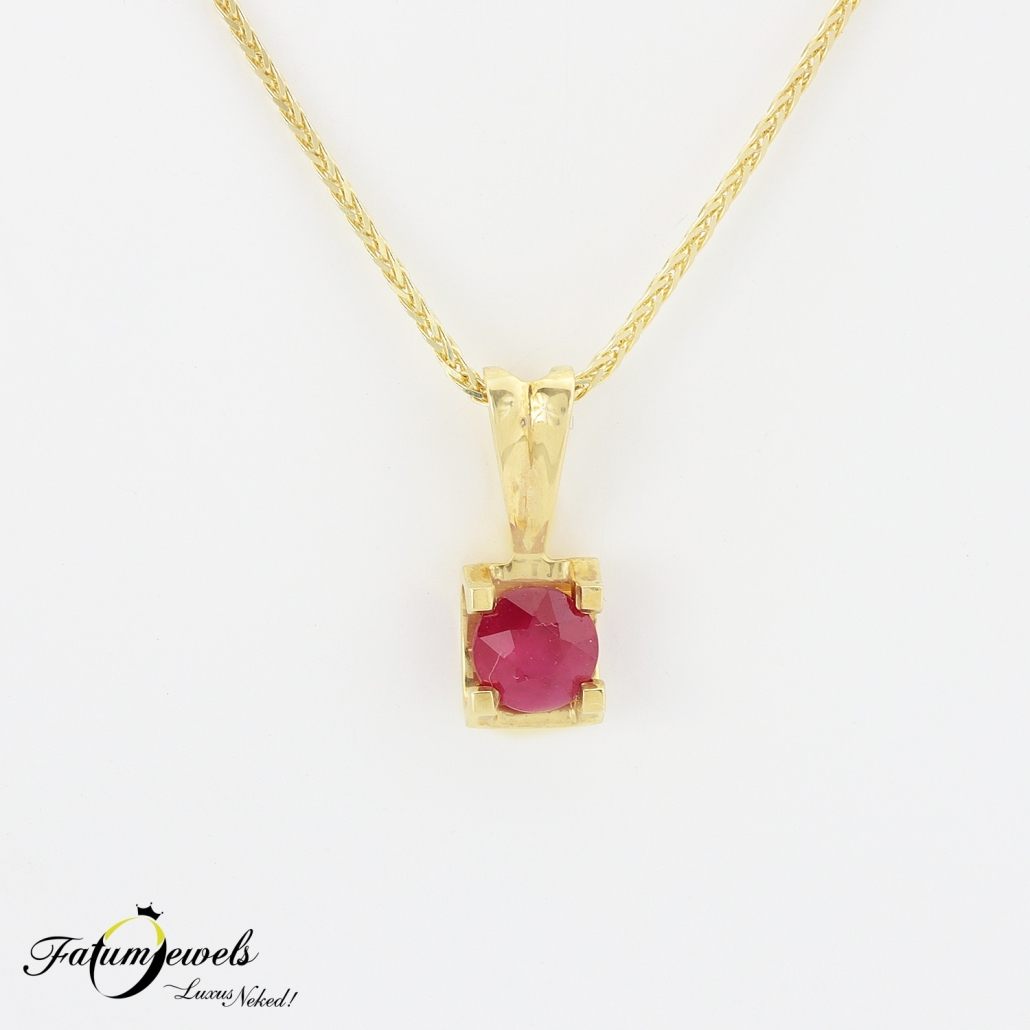 A sárga arany rubin medál modern, mégis időtlen stílusát a négyzetes hatású foglalat adja, amely diszkréten öleli körül a drágakövet, kiemelve annak mély, vörös színét. Ez a letisztult forma tökéletesen illeszkedik a mindennapi viselethez és az alkalmi eleganciához egyaránt.