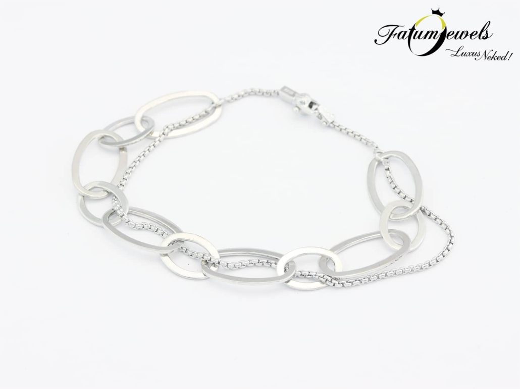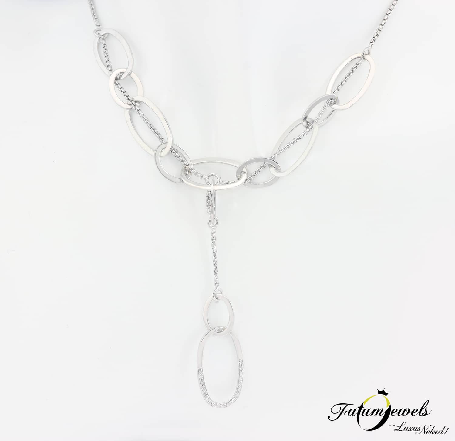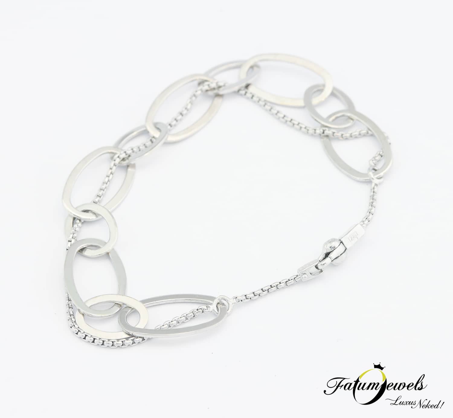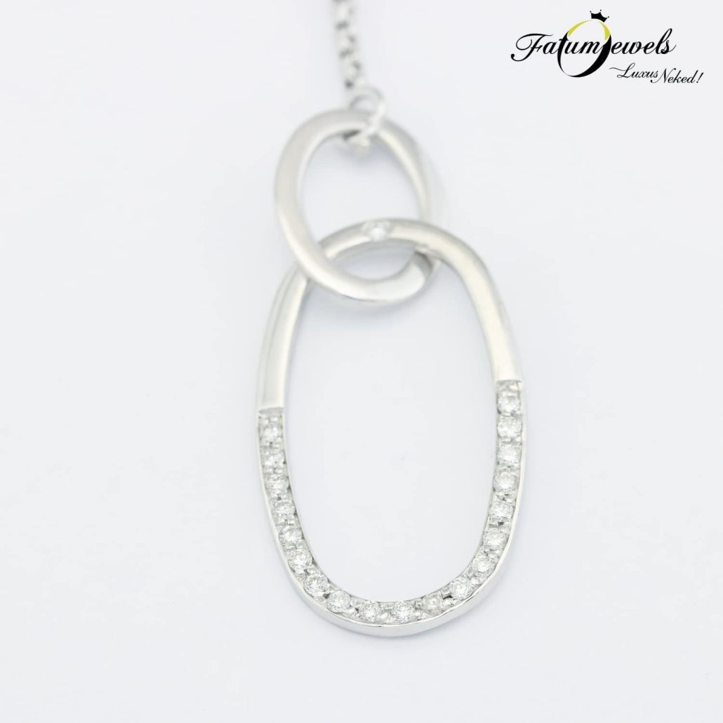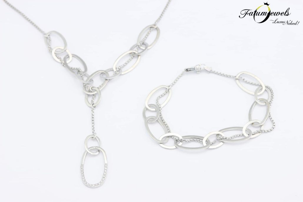 Ez a fehérarany dizájn gyémánt szett egy igazán karakteres darab azok számára, akik szeretik ötvözni a modern megjelenést az elegáns részletekkel. A lánc és a karkötő játékos ovális formái dinamizmust, szabadságot és energiát sugároznak, miközben a gyémántok finom csillogása a luxus érzését viszi az ékszerbe.