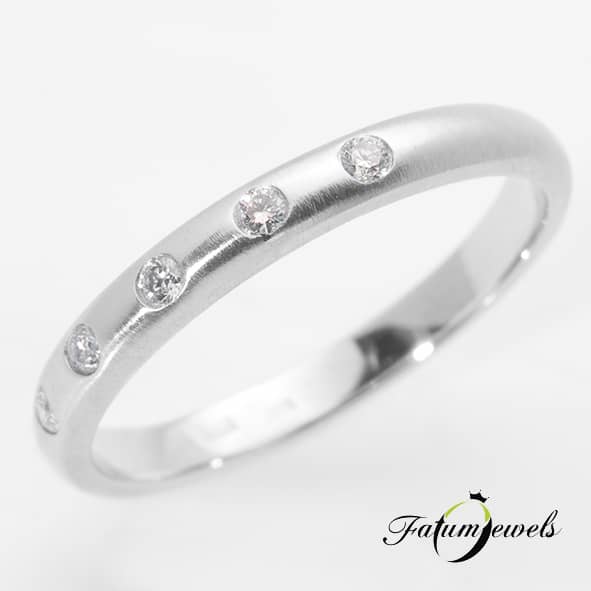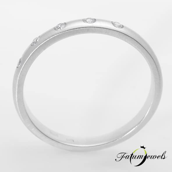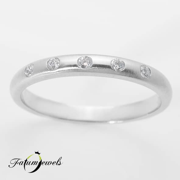 Karikagyűrű női párja vagy eljegyzési gyűrű? A döntés egyedül rajtad múlik. Bármelyik is lesz, a maga egyszerűségében különleges. Letisztult formatervezése, az öt süllyesztett briliáns gyémánt és a szálhúzott felszín nem hétköznapi ékszert mutat számunkra. A Fatumjewels Galéria a különlegességeket kedvelő, ám kissé visszahúzódó hölgyek számára tervezte ezt az ékszert.