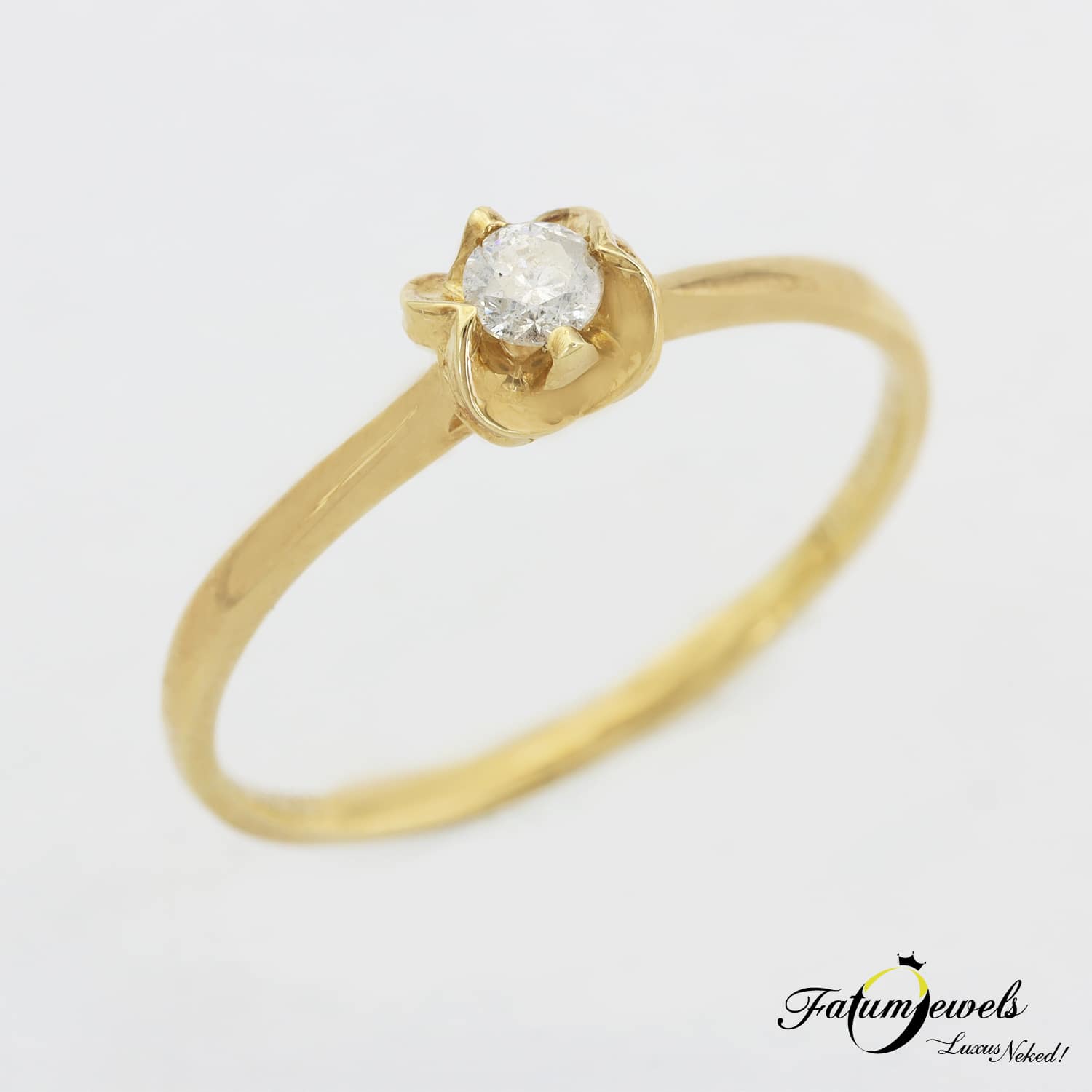 Az éppen nyíló virág szépségét megmutató eljegyzési gyűrű, melyen a virágszirmok tartják a briliáns gyémántot. Az finoman elkeskenyedő szélek kiemelik a virágszirom hatást, kecsessé teszik az eljegyzési gyűrű formáját. A fényes felület és a gyémánt ragyogása együttesen fejezi ki az ébredő természet és a szerelem erejét. A természet ihlette sárga arany eljegyzési gyémánt gyűrű a Fatumjewels kínálatában.