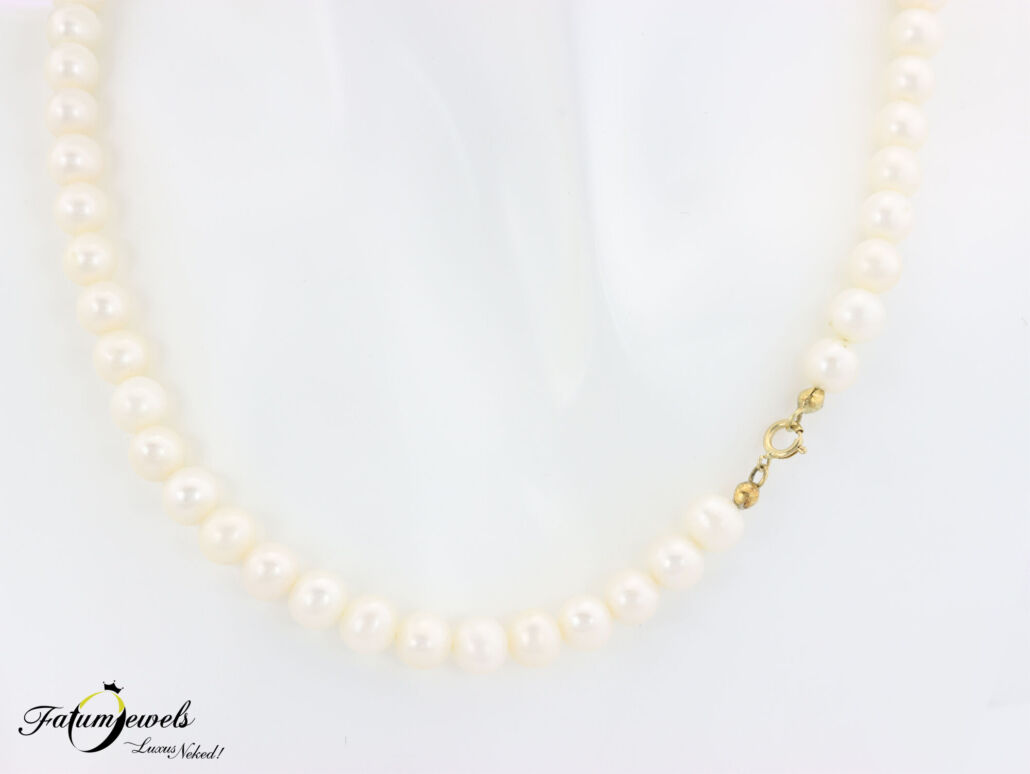 Ki állítaná napjainkban, hogy a luxus nem elérhető? Meglehetősen kedvező áron kínálja a Fatumjewels Galéria ezt az édesvízi fehér gyöngysort mely enyhén barokk formájú valódi gyöngyökből áll. A kapocs hagyomány szerinti sárga arany. Hagyományos színek, különleges formák. Ez jellemzi ezt az édesvízi fehér gyöngysort sárga arany kapoccsal, mely fellelhető a Fatumjewels Galéria gyöngy ékszer kínálatában.