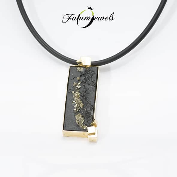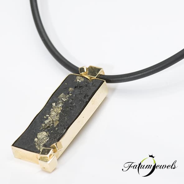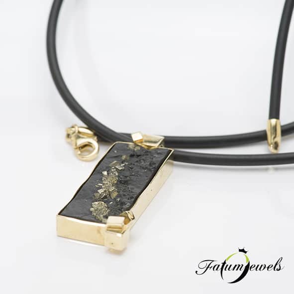 Sárga arannyal keretezett 40,5×15 milliméteres fekete pirites pala, mindez arany kaucsuk nyakláncon. A Fatumjewels Galéria egyedi tervezésű férfi ékszerei között fellelhető ez az érdekes és elegáns darab, mely akár alkalmi, akár hétköznapi viselethez tökéletes kiegészítő. Az arany-fekete színösszeállítás minden időkben az eleganciát jelentette. Miért ne lehetne mindezt érdekes alapanyagokkal és érdekes formatervezéssel megalkotni?