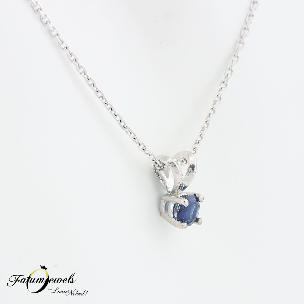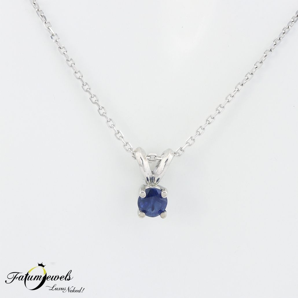 Lágy és sarkos, hagyományos és modern, ezek a jellemzők jól megférnek egymással egy Fatumjewels zafír medál keretei között. A 0,35 karát kerek csiszolású mélykék zafír drágakövet szorosan öleli a fehérarany foglalat. A medál foglalatának az alsó része enyhén szögletes, de a kilon része lágyan ívelt, és ez a kettősség modern megjelenést biztosít. Az esküvőre valami kék még hiányzik? Ez a zafír medál esküvői ékszerként is megállja a helyét. Fatumjewels Galéria által tervezett fehérarany zafír medál lánccal