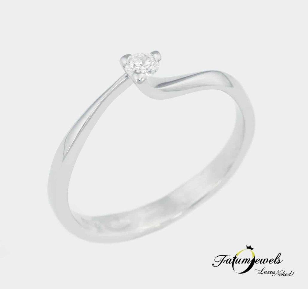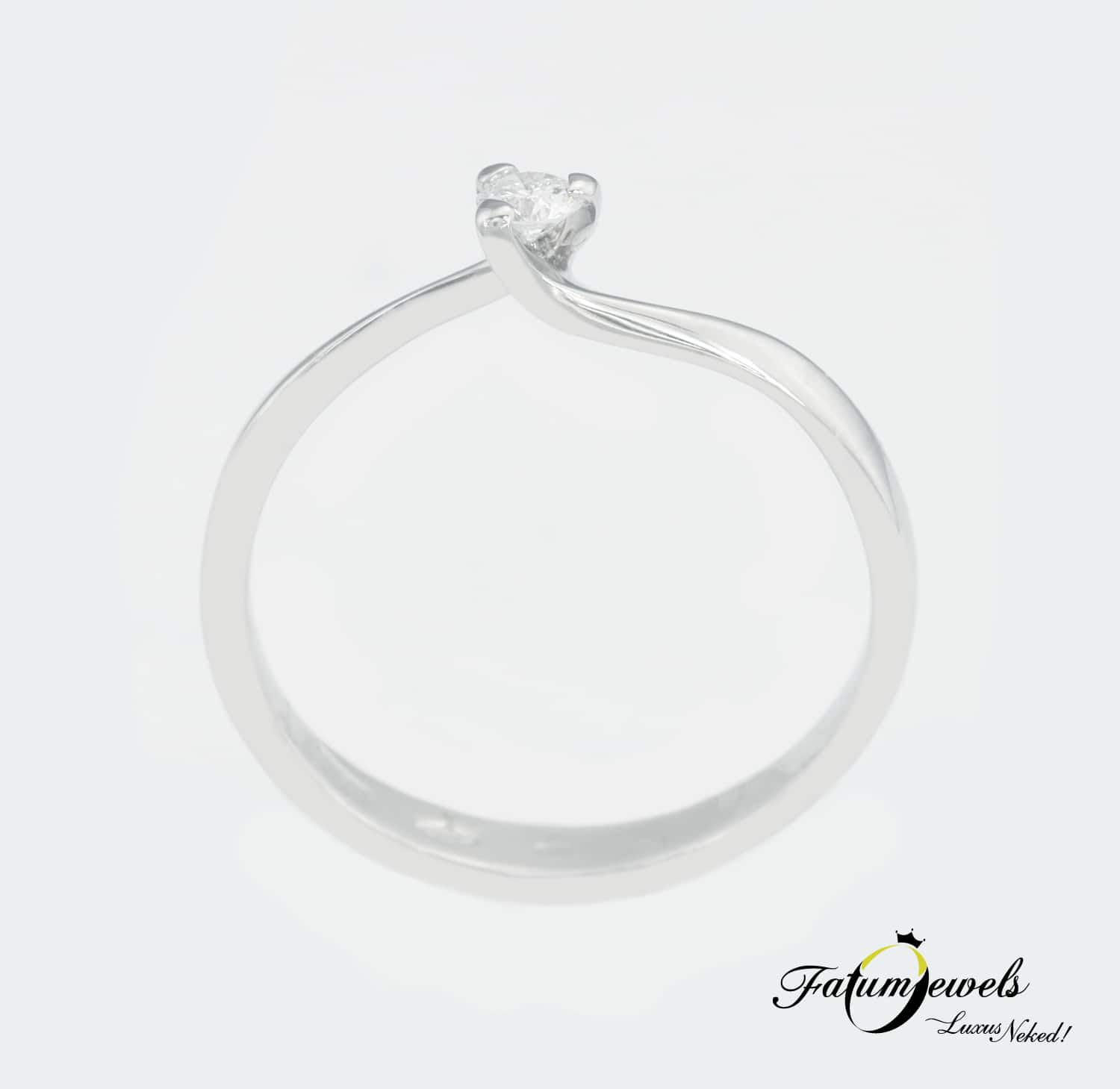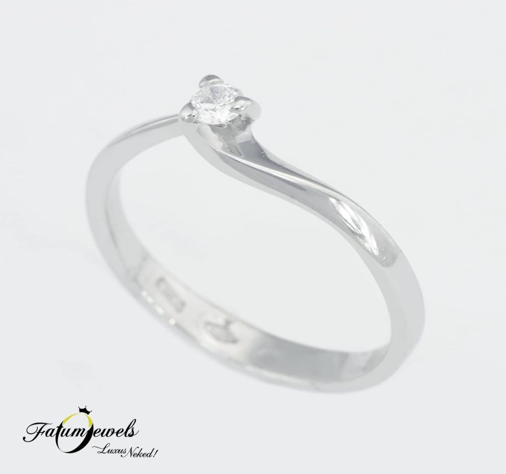 Szakítani akarsz az eljegyzési gyűrű hagyományaival? Ehhez ez a fehérarany gyémántgyűrű a legjobb választás. Szemből tekintve olyan érzésed támadhat, hogy három gyűrűvég került a semmiből a briliáns gyémánt köré. Szépen megcsavarta a Fatumjewels Galéria a gyűrűvégeket, így jött létre ez a modern formatervezésű fehérarany gyémánt eljegyzési gyűrű.