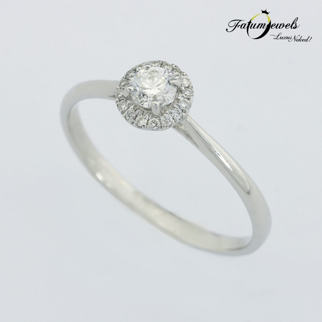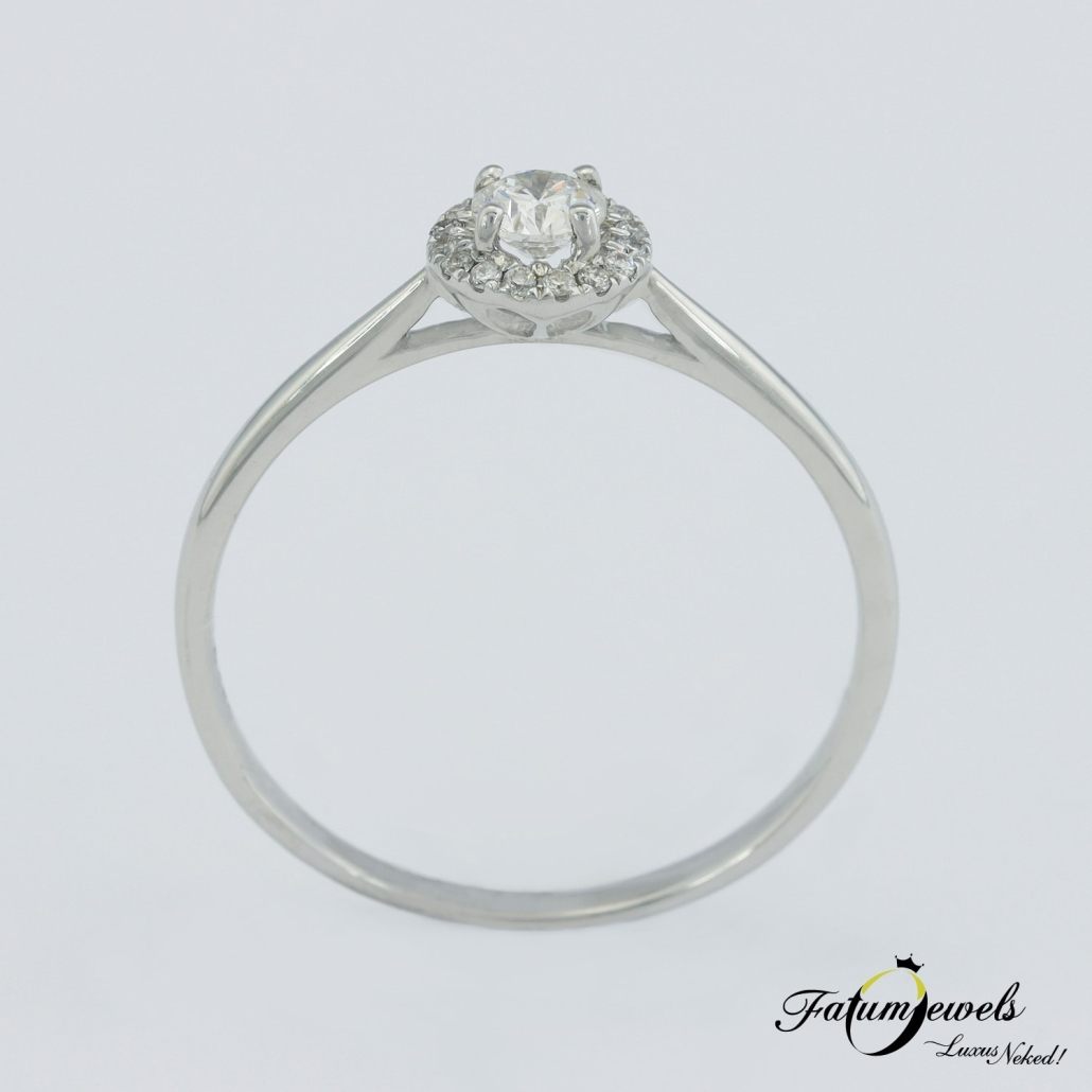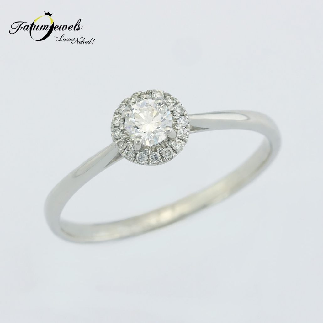 Ha csak egyetlen pillantást is vetsz erre a ragyogó fehérarany gyémánt eljegyzési gyűrűre, azonnal beleszeretsz. Talán pont úgy, olyan villámcsapásként, ahogy egykor a kedvesedbe. A központi gyémánt szemet gyönyörködtető ragyogását, és szépségét még inkább kiemelik a körülötte lévő apróbb gyémántok, ahogy az ezernyi csillag ragyog az éjszakai égen. Egy ilyen gyűrű nemcsak az örök elköteleződés szándékának a jele, hanem egy olyan ékszer, amely minden nap emlékeztethet benneteket a szerelmetek erejére és tisztaságára.