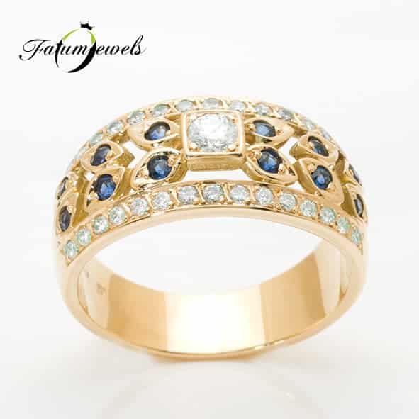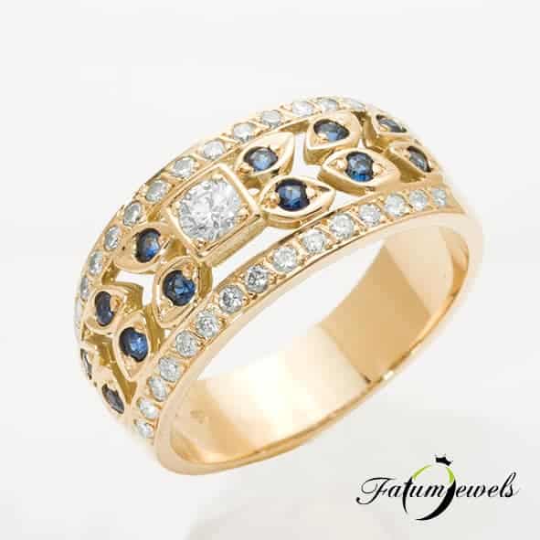 Széles aranygyűrű, mely áttört felszínével szinte csipkehatást kelt. A gyűrű gyémántokkal szegélyezett, felszínét zafír levélkék borítják. Fatumjewels Galéria által tervezett gyémánt zafír gyűrű kifejezetten alkalmi viselethez. Házassági évfordulóra és egyéb jeles ünnepekre ajánlott ajándék a Fatumjewels Galéria ajánlásával.