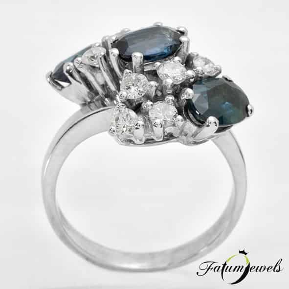 A sötétkék égbolt és a szikrázó, életet adó levegő színei keverednek ebben a csodás drágakő csokorban, mely ezt a Fatumjewels Charleston gyémánt zafír gyűrűt díszíti. Extrém formatervezés különleges hölgyek számára. A három égszínkék zafír között briliáns gyémántok teszik teljessé a csokrot a Fatumjewels Galéria tervezésében