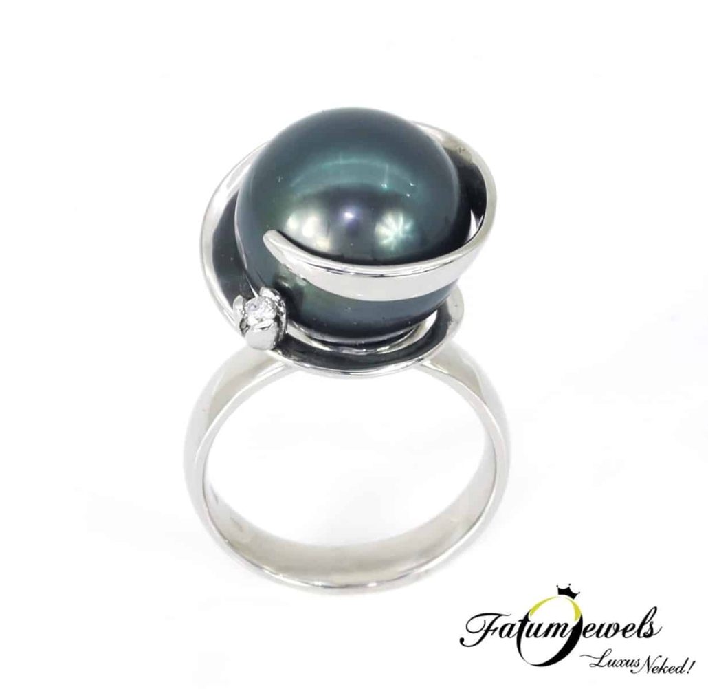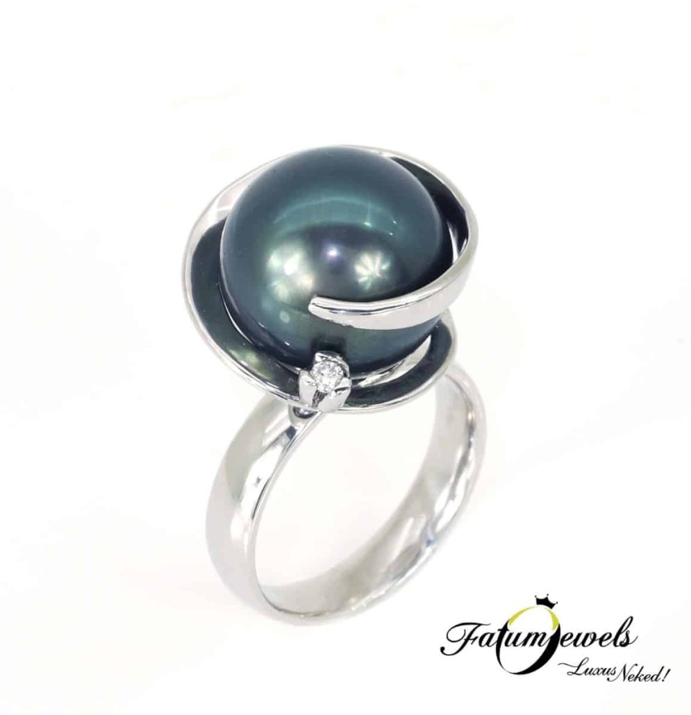Egyedi Fatumjewels tahiti gyöngy gyűrű. A sötét zöldeskék gyöngyöt szó szerint körülöleli a fehérarany. A briliáns gyémánt még tovább növeli a ragyogást. Különleges alkalmi ékszerre vágysz? Megtaláltad! Különleges színű tahiti gyöngy fehérarany ölelésben a hideg színek kedvelőinek a Fatumjewels Galéria ajánlásával.