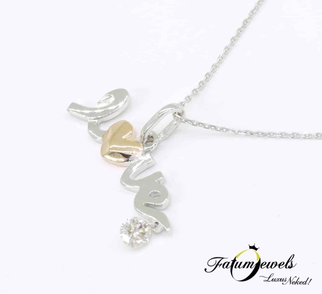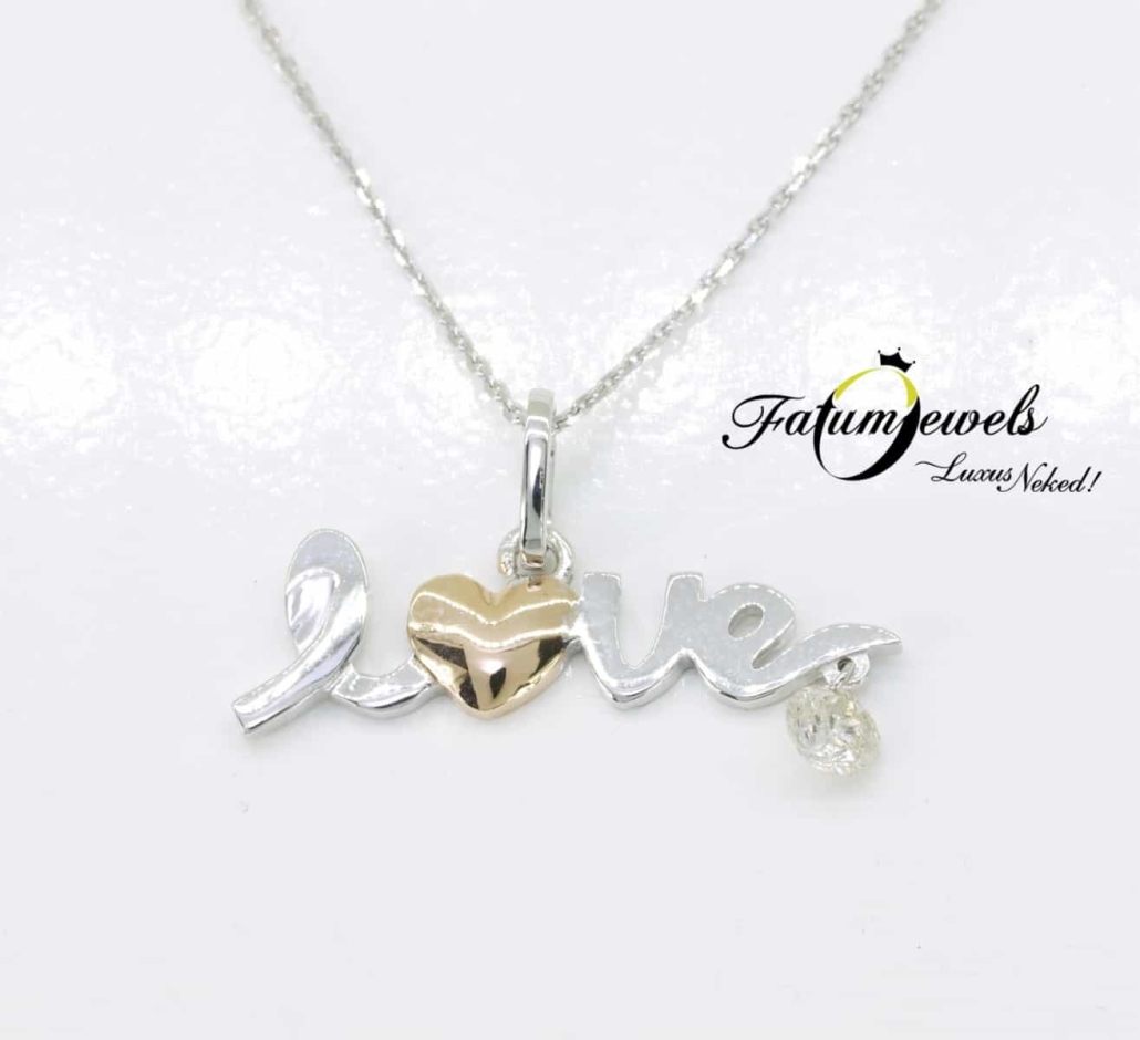 Azok az ékszerek jelentik a legszebb ajándékot, melyek érzelmeinket, illetve a megajándékozott személy jellemét fejezik ki. Pontosan ezzel a céllal készítette a Fatumjewels Galéria ezt a gyémánt Love sárga fehér arany medált lánccal, mely a szerelmet, a szeretet fejezi ki. A medál 42 cm hosszú láncot és egy 0,11 karátos briliáns gyémánt drágakövet kapott.