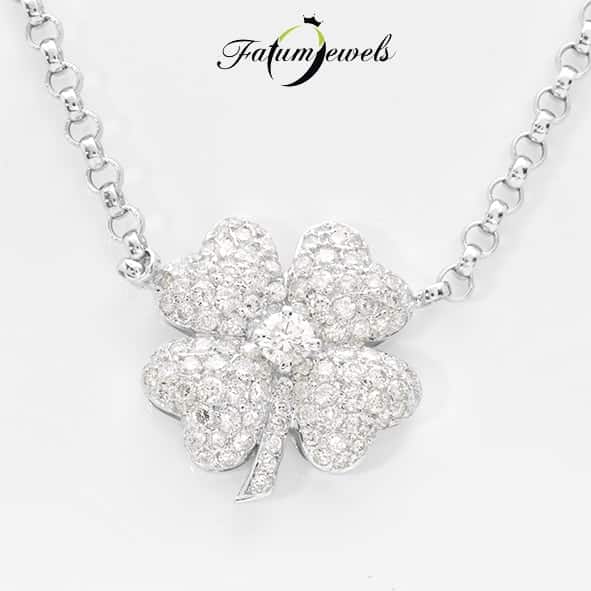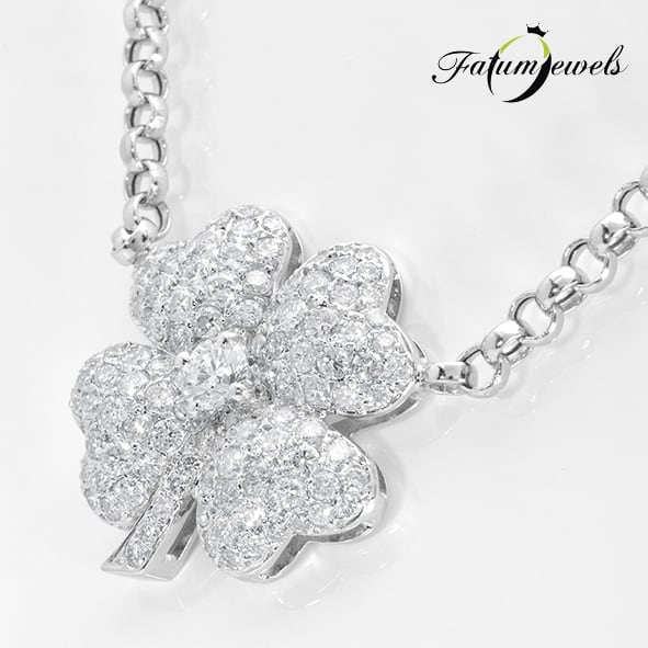 2,67 karát briliáns gyémánt borítja be a fehérarany lóhere teljes felszínét. Kell ennél hívogatóbb szerencsehozó nyakék? A Fatumjewels Galéria azoknak tervezte ezt a briliáns gyémánt lóhere nyakéket, akik szerencsére vágynak, vagy éppen ellenkezőleg, a szerencsés hölgyeknek. Fatumjewels szerencsehozó ékszerek.
