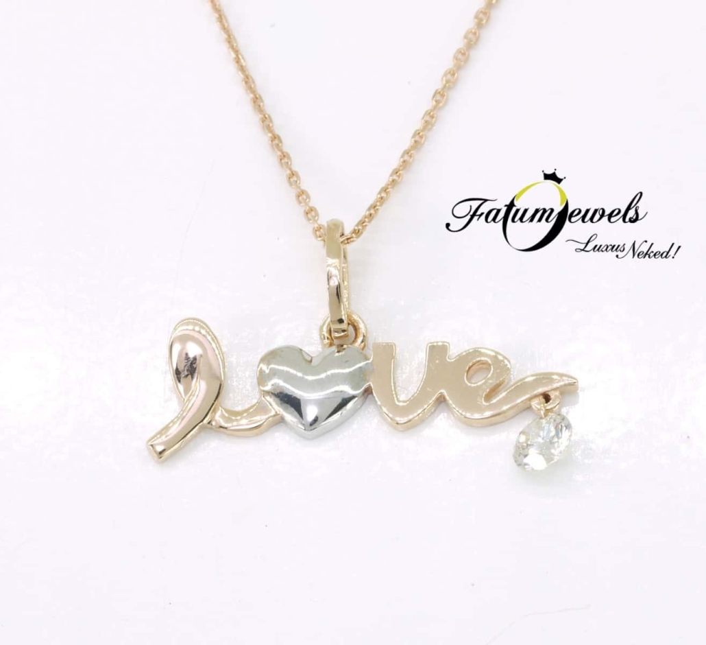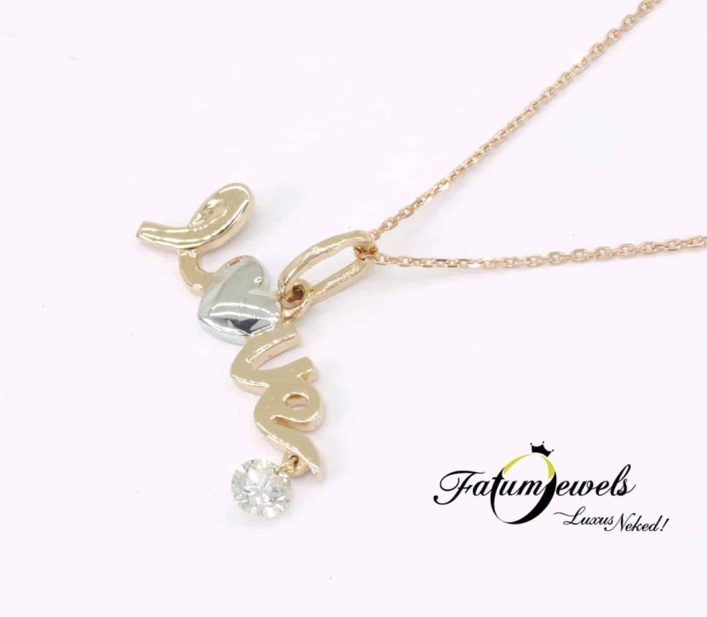 Tökéletes ékszer a szeretet kifejezésére ez a Fatumjewels bikolor Love medál nyaklánccal, mely díszítésként egy briliáns gyémánt drágakövet kapott. Csodás ékszer, mely magában hordozza a szeretetet. A Love felirat O betűje fehérarany szív, ami még tovább fokozza a romantikus ajándék hatásfokát. Fatumjewels romantikus ékszer.