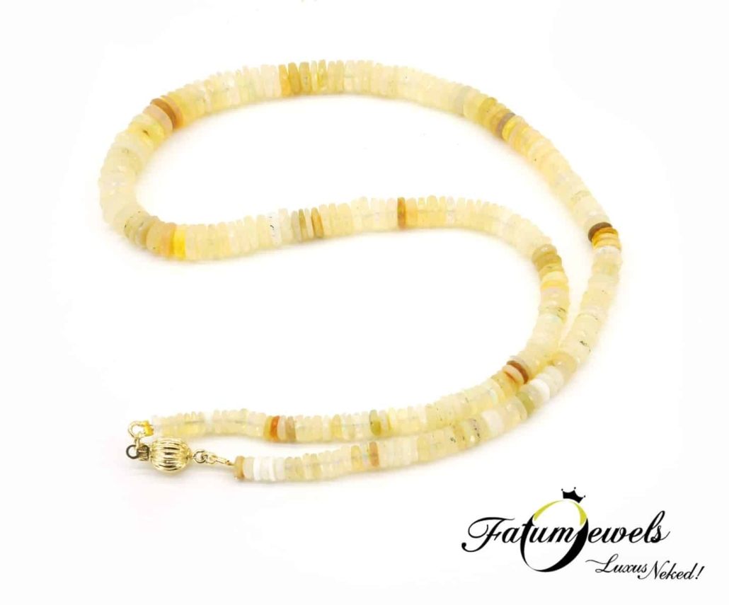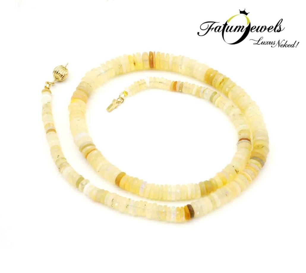 A hagyomány szerint opál ékszer a 14. és a 18. házassági évforduló legkiválóbb ajándéka. A Fatumjewels Galéria ékszerkínálatában igen kedvező áron elérhető ez a fazettált opál nyaklánc, mely sárga arany kapcsot kapott. A spirituális hagyományok a remény kövének tartják, így bármilyen alkalomra kedves ajándék lehet.