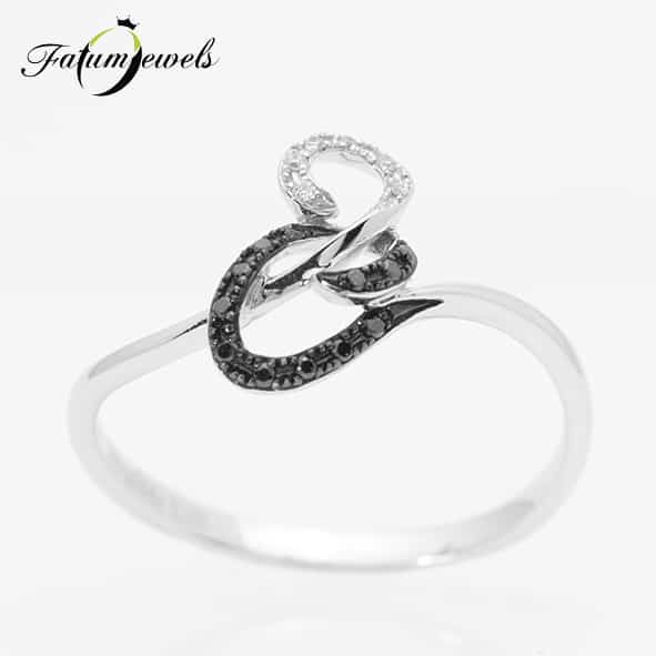 Egymásba akadt, gyönyörűen ívelt gyémánthurkok, melyek két ember szoros kapcsolatát jelképezik. Fekete és fehér briliáns gyémánt drágakövekkel díszített egyedi fehérarany gyűrű a Fatumjewels Galéria tervezésében. Csodálatos dizájn, egyedi színek, mely akár egy különleges hölgy eljegyzési gyűrűje is lehet. Fatumjewels gyémántgyűrű.