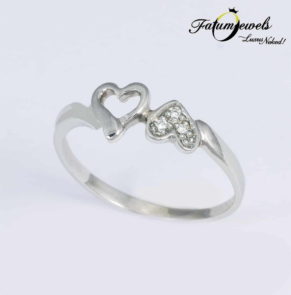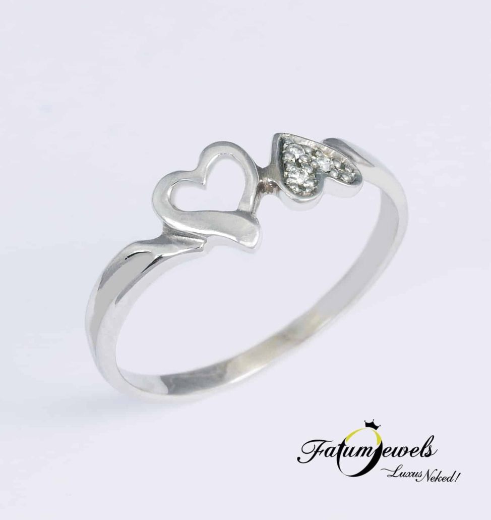Két szív, melyek egymás ellentétei. Az egyik gyémántokat, a másik légüres teret foglal magában. Ez valójában nem két embert személyesít meg, hanem egy kapcsolat pozitív és negatív oldalát. Pontosan azt fejezi ki, amikor két szív kiáll egymás mellett jóban rosszban. Tökéletes eljegyzési gyűrű. Ráadásul ez a Szív fehérarany gyémántgyűrű a Fatumjewels Galéria kínálatában most remek áron elérhető.