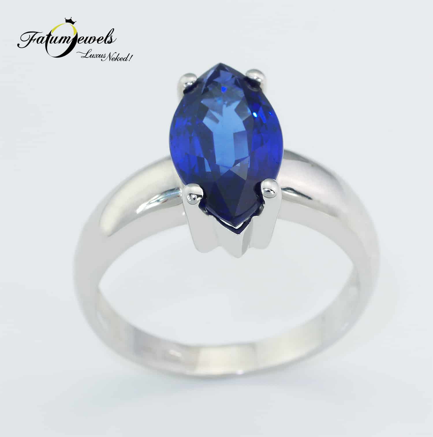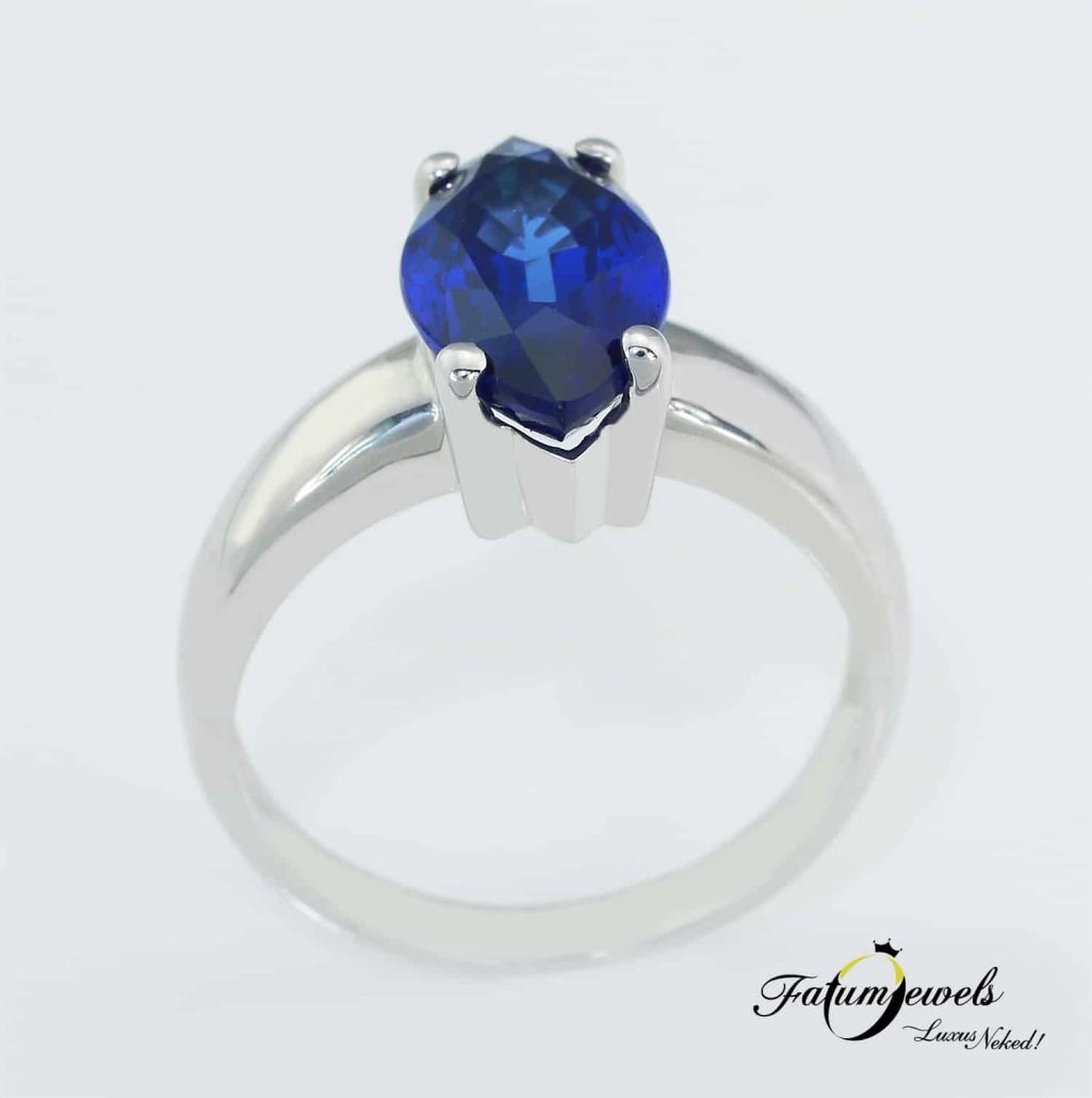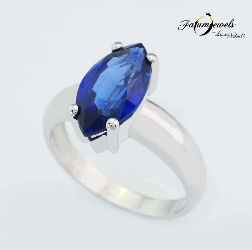 Az egyszerűség gyönyörködtet, főként ha erre csodálatos fehérarany zafír gyűrűre tekintünk. Egyenes vonalvezetésű fehérarany gyűrű egyetlen márkiz csiszolású mélykék zafír drágakővel. A méretek, a formák, a színek tökéletes összhangot nyújtanak. A Fatumjewels Galéria az egyszerűségben rejlő erőt és szépséget kívánta megjeleníteni egy egyedi ékszer révén.