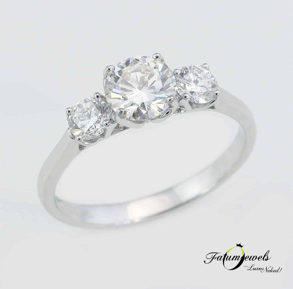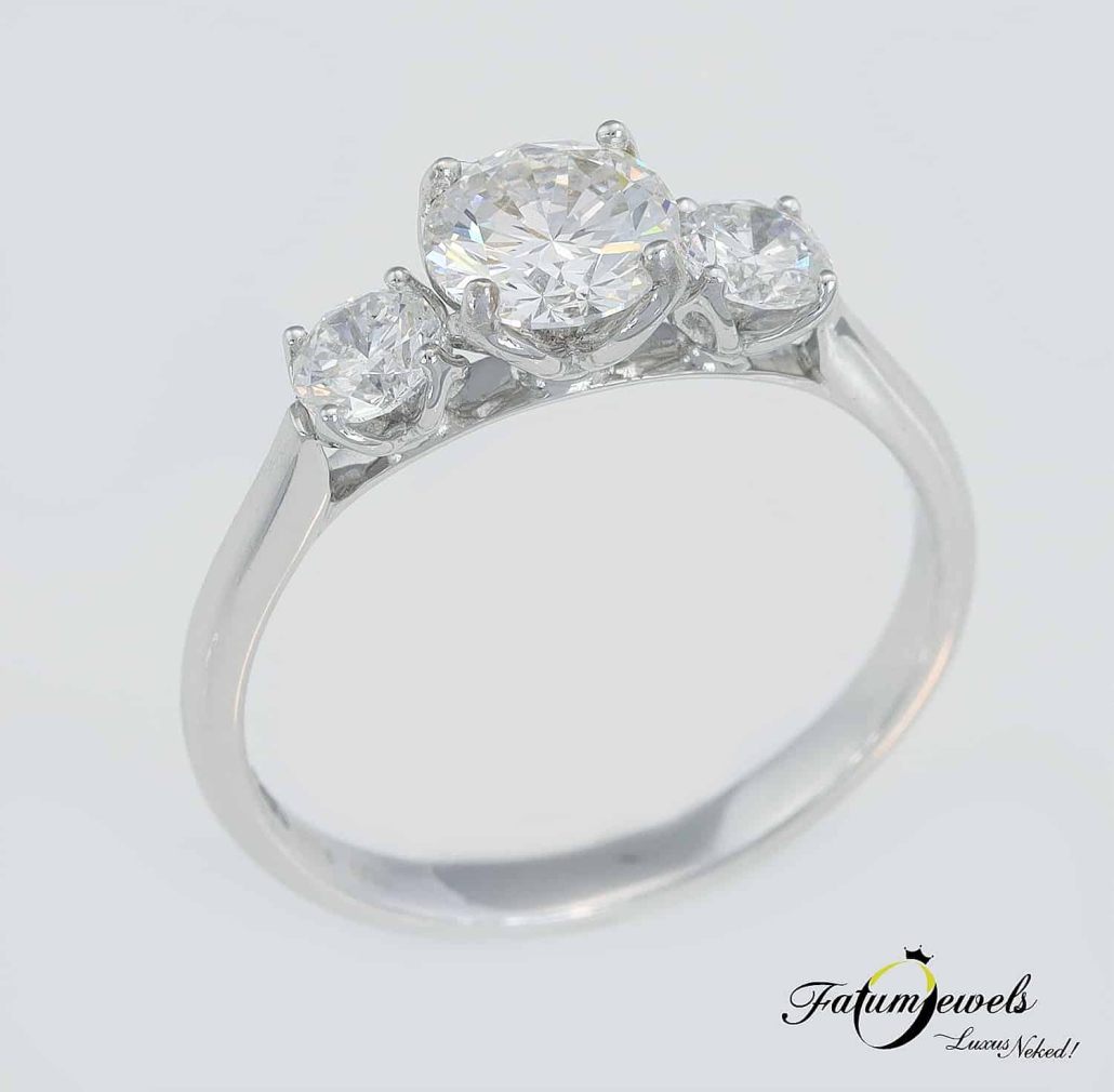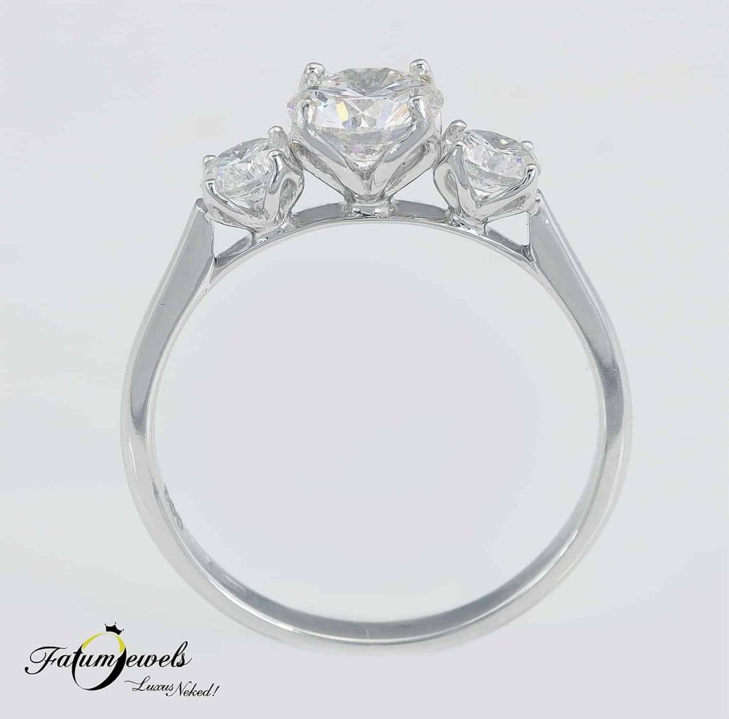 A háromköves eljegyzési gyűrű a hagyományos és a modern eljegyzési gyűrű között helyezkedik el félúton. Tökéletes választás azok számára, akiket egyformán vonz a hagyományos és a modern érzés. Ez a Fatumjewels egyedi gyémántgyűrű különleges gyémántokat kapott, melyek össztömege meghaladja az egy karátot. A központi gyémánt kiváló minőségét HRD tanúsítvány igazolja. Itt az alkalom, hogy igazán különleges ékszerrel kérd meg kedvesed kezét.