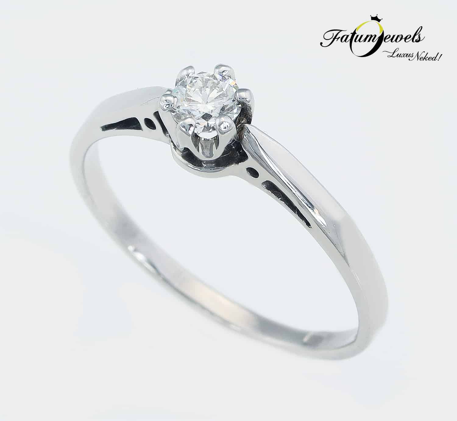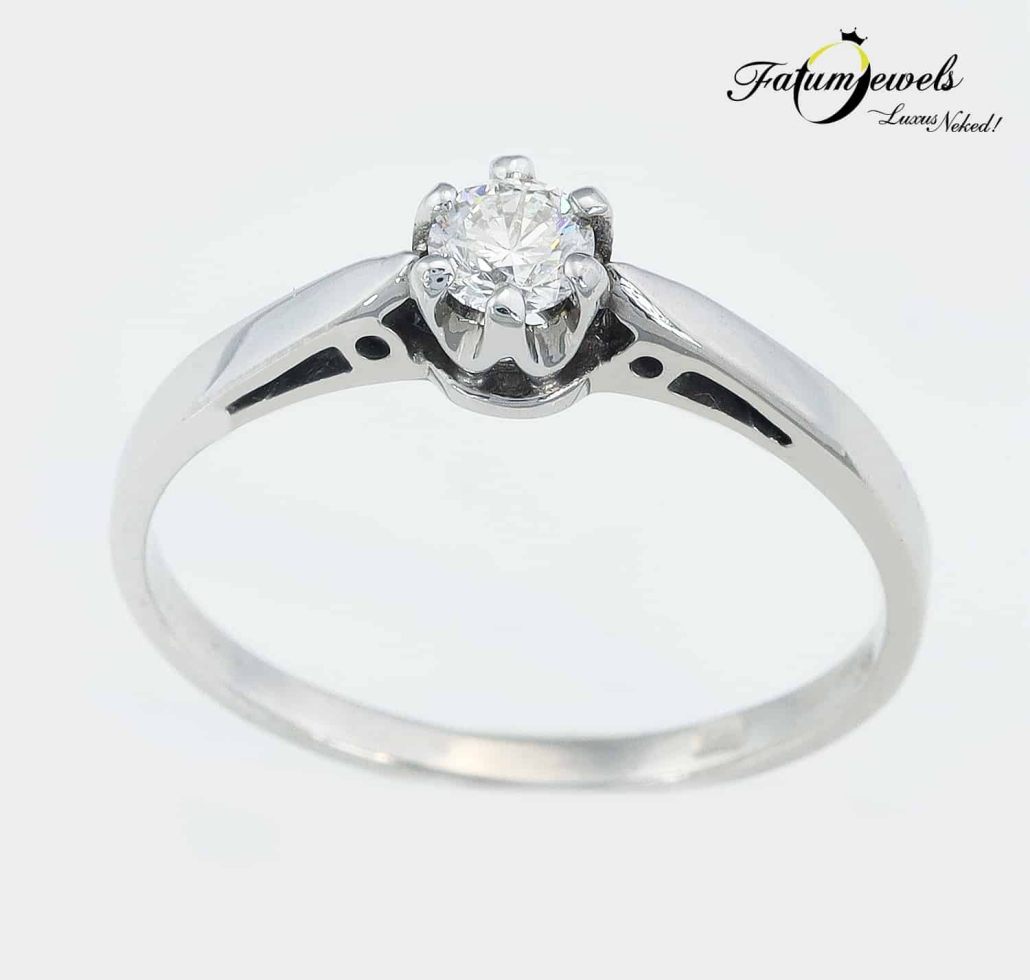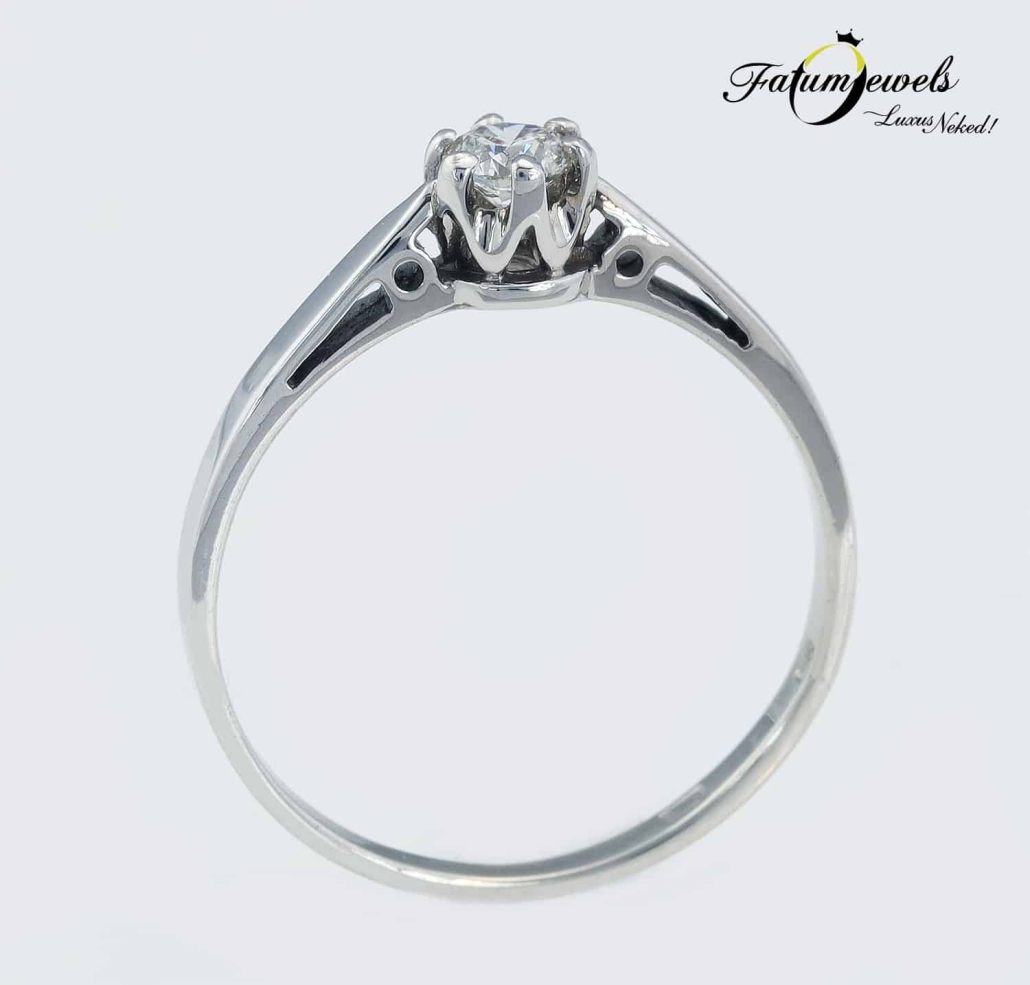 Hagyománykedvelő hölgy kezét szeretnéd megkérni? Akkor ez a klasszikus gyémántgyűrű éppen a Te számodra készült a Fatumjewels Galéria jóvoltából. Valódi tradicionális egyköves szoliter eljegyzési gyűrű egy briliáns gyémánt drágakővel. Klasszikus vonalvezetésű gyűrű a maga nemes egyszerűségében. A fehérarany fényes felszíne és a briliáns gyémánt ragyogása csodás meglepetés lesz a lánykérés alkalmával.