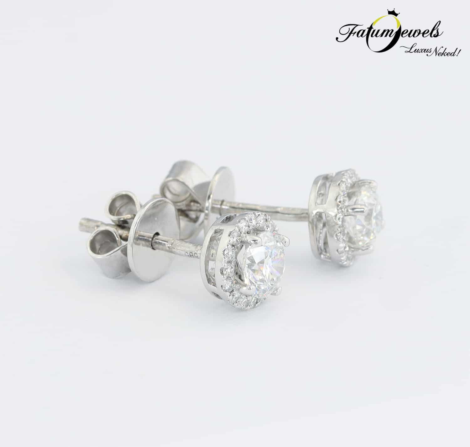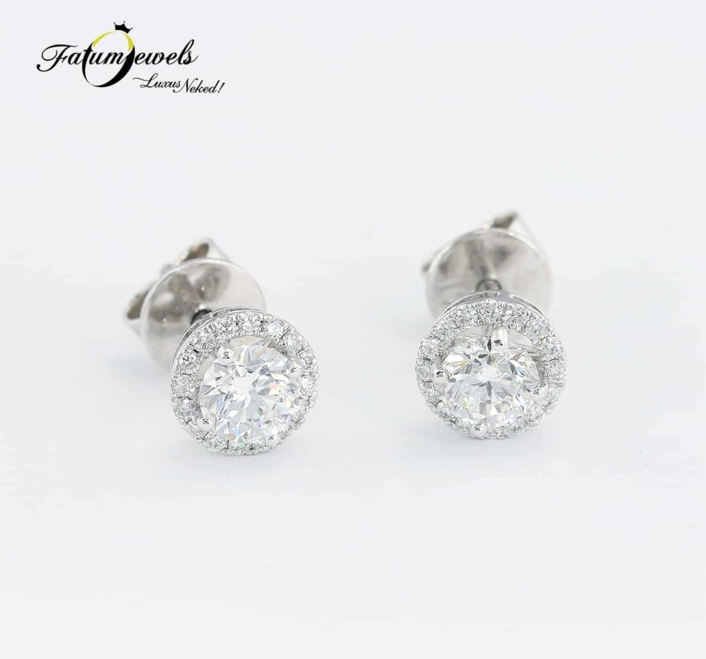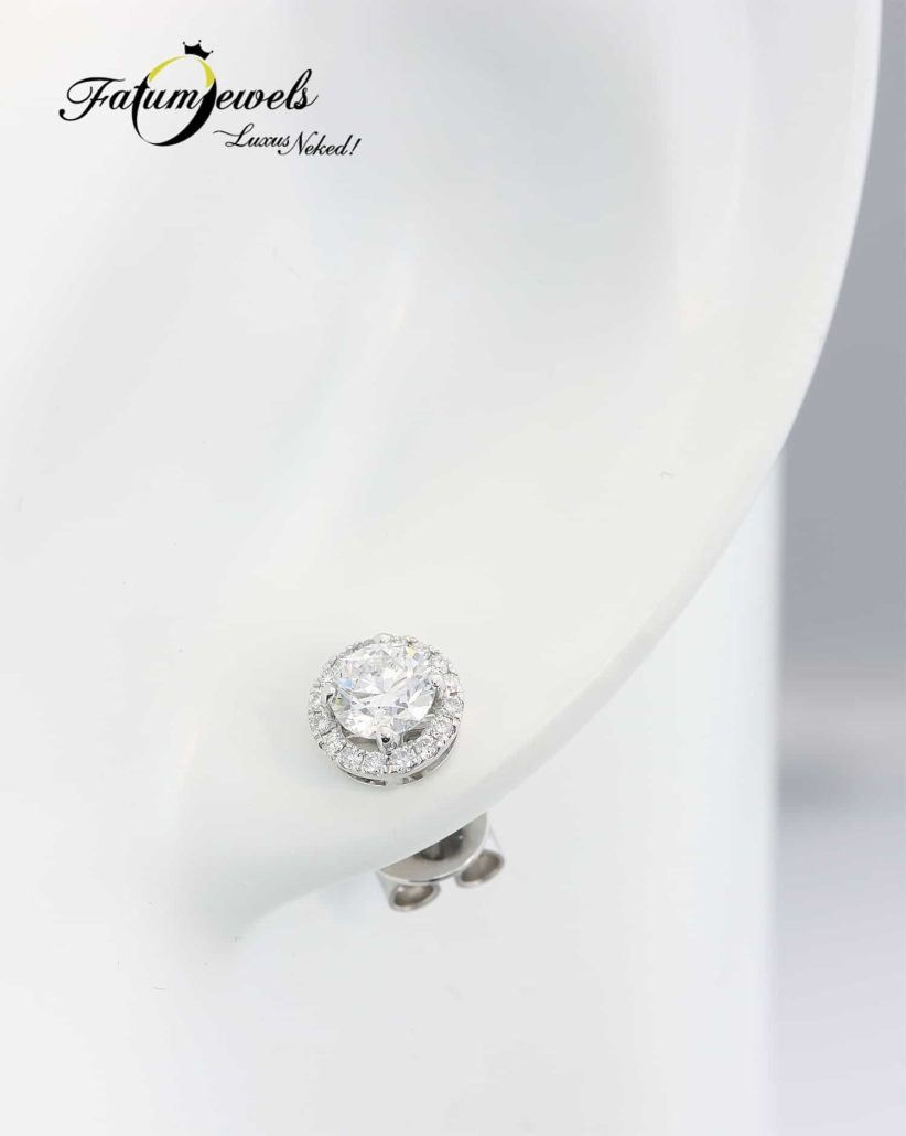A gyémánt tüze még szebben szórja szét csodálatos szikráit, ha tökéletes elrendezésben részesül. Éppen ezt láthatjuk ezen az egyedi Fatumjewels gyémánt fülbevalón, ahol a briliáns gyémántot újabb briliáns gyémántokból álló glória veszi körül. Ezzel a fülbevalóval felhívhatod magadra a figyelmet, mielőtt még akár egy szót is kiejtenél a szádon. Ragadd meg az alkalmat!