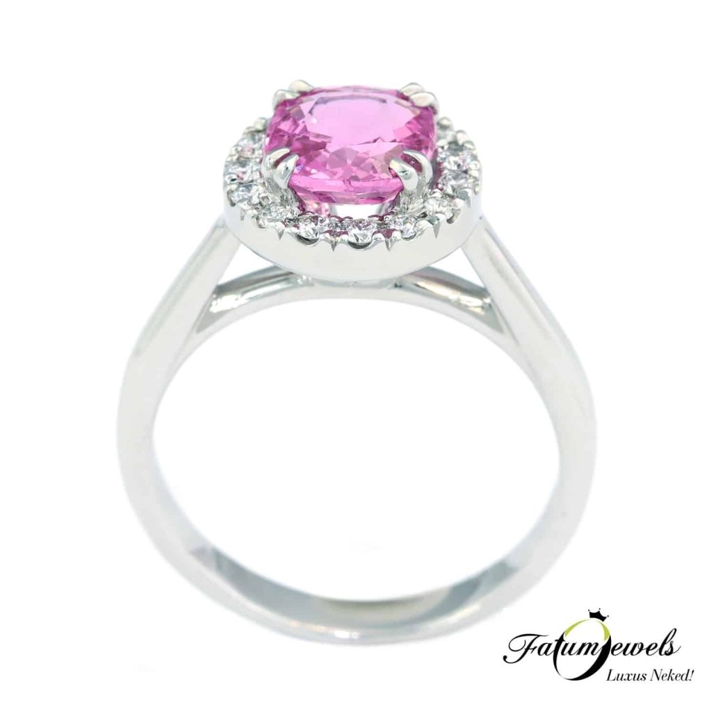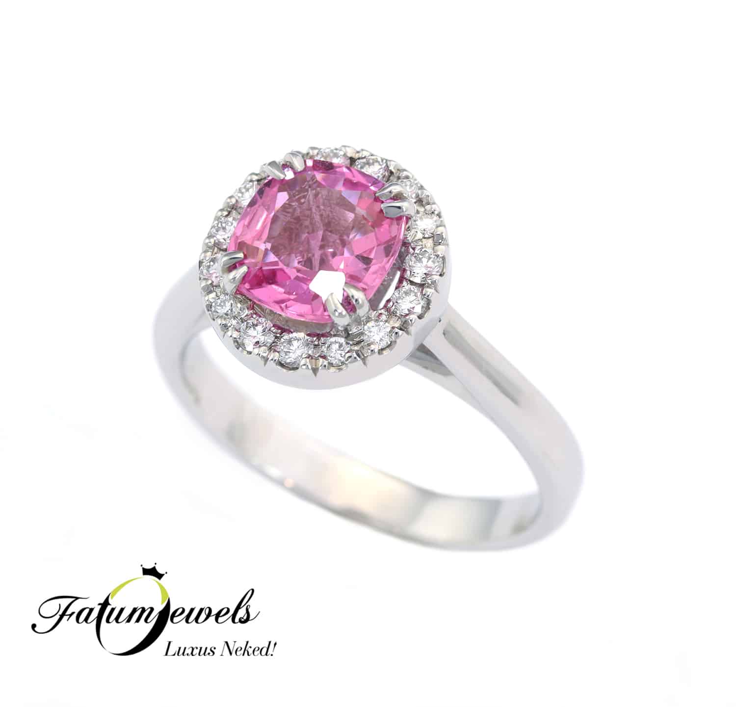 A rózsaszín álom valóra válhat egy rózsaszín álomgyűrű formájában. Hagyományos formatervezés romantikus színekkel, ezt hozta létre a Fatumjewels Galéria. Így jött létre ez a különleges, egyedi fehérarany gyémánt rózsaszín zafír gyűrű. Azért egy kis formabontás olykor nem árt. Éppen ezért a kerek formákba beillesztve egy cushion csiszolású rózsaszín zafír került.