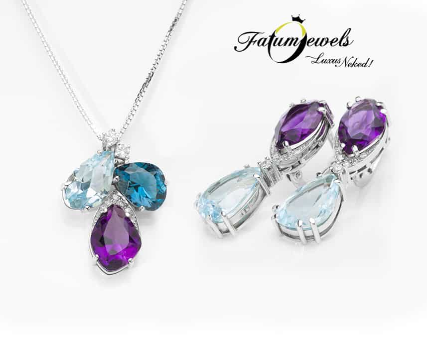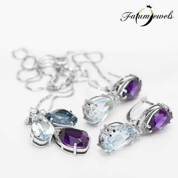 Kék-lila árnyalatú drágakövekből létrehozott ékszer szett a Fatumjewels Galéria színes ékszer kínálatából. Fehérarany ékszer szett gyémánt, ametiszt és topáz drágakövekkel díszítve. A fülbevaló, mint a jég és a bársony, némi gyémánt jégvirággal. A medál egy valódi drágakő csokor fehérarany nyaklánccal. Csodás topáz jég, melyet az ametiszt lila színe sem képes felmelegíteni.