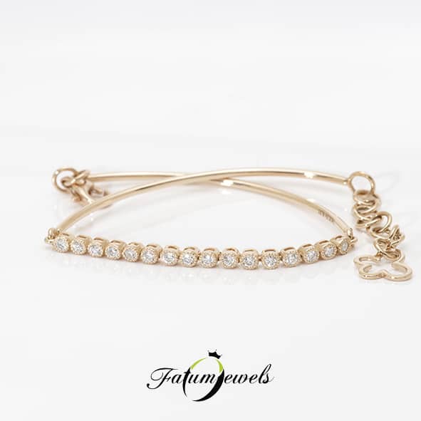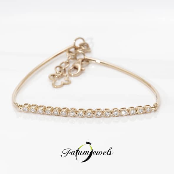 Rozé arany karkötő 16 briliáns gyémánttal a Fatumjewels Galéria tervezésében. A karkötő díszítése egy valóságos gyémántlánc, mely 16, 0,31 karát briliáns gyémántból áll. Diszkrét, elegáns külsőt kölcsönöz viselője számára, akár hétköznap, akár különleges alkalmakra. A rozé arany lággyá varázsolja ezt az ékszert.