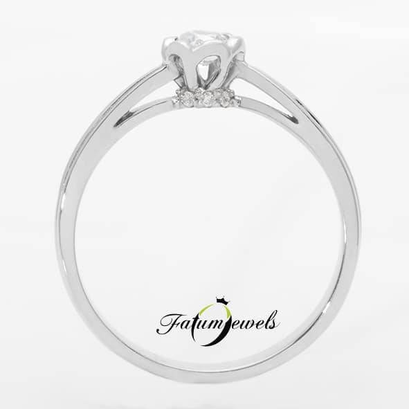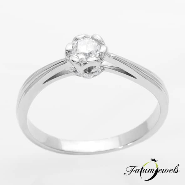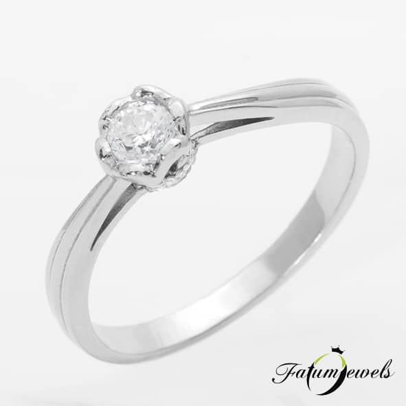 Fatumjewels Gyémántbokréta eljegyzési gyűrű briliáns gyémántszalaggal átkötve. Az eljegyzési gyűrű központi briliáns gyémántját csokorként jeleníti meg a gyémántfoglalat, majd azt alul egy apró, hat gyémántból álló szalagocska köti bokrétába. Szeretnél olyan virágot ajándékozni kedvesednek, mely soha nem hervad el? Fatumjewels Gyémántbokréta eljegyzési gyűrű a válasz.