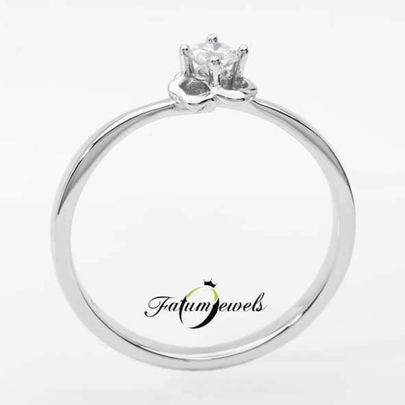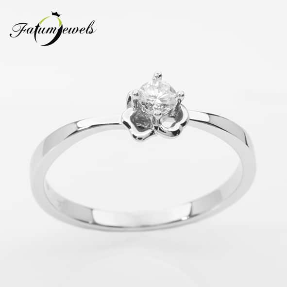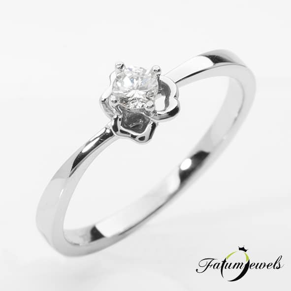 Harmatos Virág gyémánt eljegyzési gyűrű alacsony áron a Fatumjewels Galériában. A briliáns gyémánt foglalatát egy fehérarany virág támasztja alá, melyről mintha a nyári hajnali harmat csöppenne le éppen. A harmatos virág közepét a briliáns gyémánt alkotja, mely kiemelkedik az eljegyzési gyűrű síkjából.