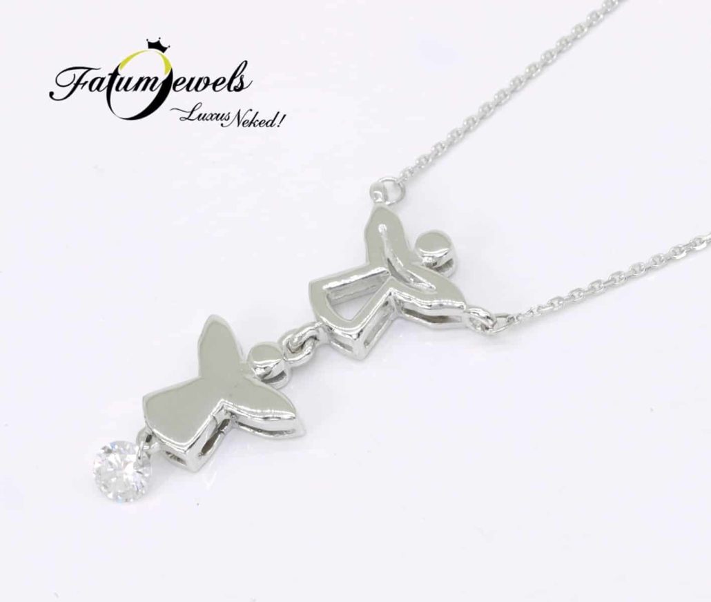 Ez a különleges fehérarany gyémánt Angyalka medál lánccal két stilizált angyalfigurát ábrázol, melyek finoman kapcsolódnak egymáshoz. Az alsó angyalhoz csatlakozó ragyogó 0,11 karátos briliáns gyémánt teszi teljessé a kompozíciót, eleganciát és fényt kölcsönözve az ékszernek. A medálhoz tartozó 42,5 cm hosszú lánc tökéletesen illeszkedik a designhoz, így Ön azonnal viselheti, vagy ajándékba adhatja ezt a csodálatos darabot.