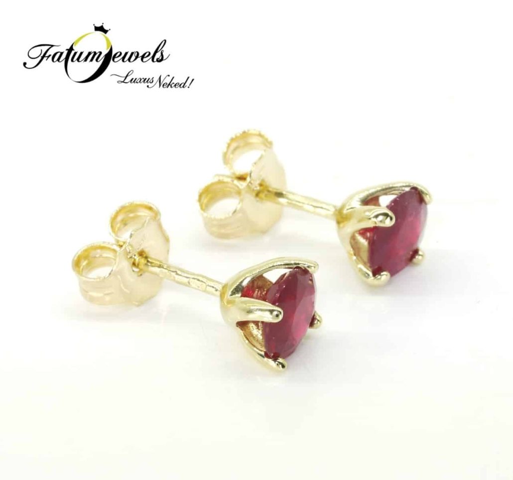 Élettel teli mélyvörös rubinnal díszített sárga arany Fatumjewels fülbevaló. A rubin sárga arany levélkékkel van megtámasztva. A drágakő tömege 1,28 karát. Tűzről pattant hölgyek tökéletes önkifejezése lehet ez a mélyvörös rubin fülbevaló sárga arany foglalatban a Fatumjewels Galéria ajánlásával.