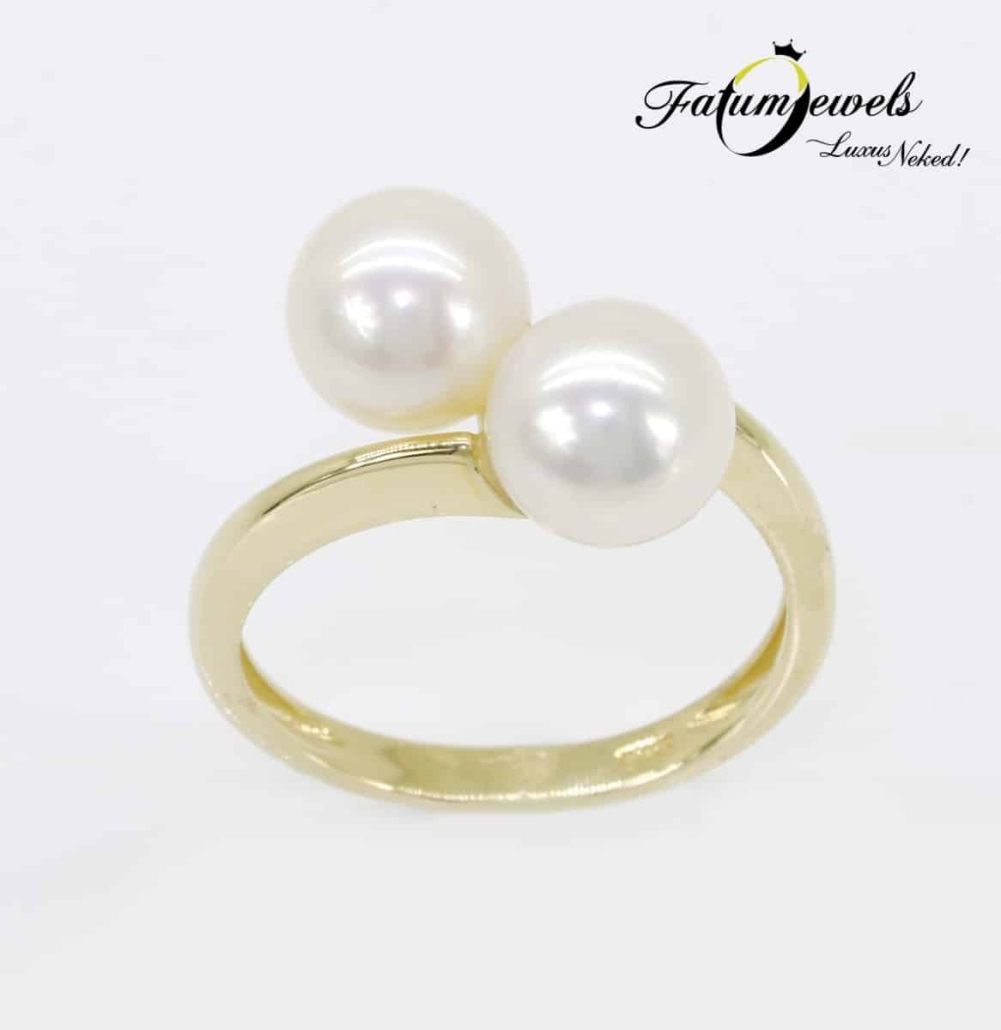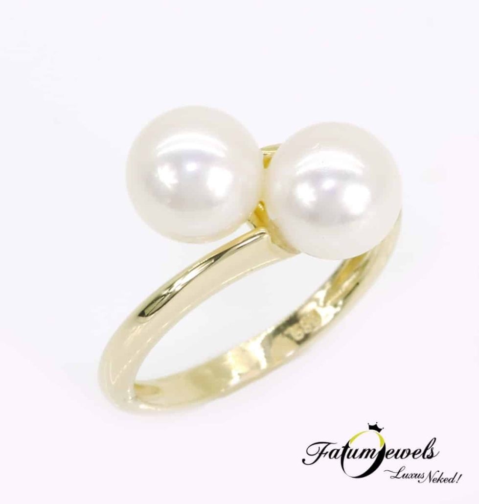 Két magas lüszterű hófehér gyöngy ékíti ezt a sárga arany gyűrűt, mely a Fatumjewels Galéria gyöngy ékszer palettáján található, és meglehetősen kedvező áron elérhető. A gyűrűvégek kapták az egy-egy gyöngy díszítést, mely harmonikus párt alkot, ami több mint kifejező ajándék lehet.