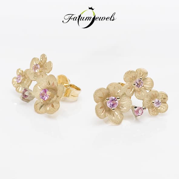 Három-három aranyvirág egy pár fülbevaló formájában a Fatumjewels Galéria fantáziadús ékszerei sorában. A virágok felülete matt, mely még természetesebbé teszi a látványt. Minden egyes virág kapott egy rózsaszín zafír drágakövet, plusz egy zafír kíséretet. Kell ennél romantikusabb ékszer? A formai kialakítása révén akár jeles események alkalmával, akár hétköznap is viselhető.