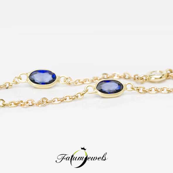 Sárga arany karlánc egy gyémánt és hat ovális kék zafír drágakővel a Fatumjewels Galéria tervezésében kifinomult ízlésű hölgyek számára. A zafír nemcsak egy esztétikus drágakő, hanem spirituálisan segít viselőjének. Elsősorban a szellemi feszültség feloldására alkalmas. Stresszes életet élsz? Ez a Fatumjewels zafír karlánc nemcsak szépséget, de nyugalmat is biztosít számodra.