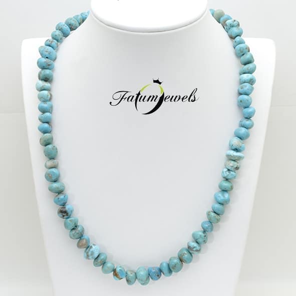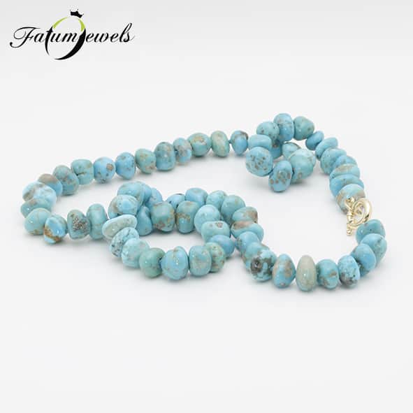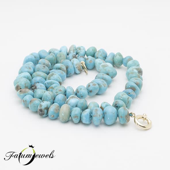 Aranykapcsos Fatumjewels arizonai türkiz nyaklánc, melynek viselése segít megőrizni a lelki egyensúlyt. A nyaklánc 69 szem türkizből áll, hossza 43 cm. Az aranykapocs tökéletesen harmonizál a türkiz színével. Az ókorban éppen ezért a türkizbe vésett feliratokat arannyal töltötték ki. Viseld magadon az ókor egyik leghatásosabb drágakövét, melynek segítségével nem fogsz kibillenni lelki egyensúlyodból!